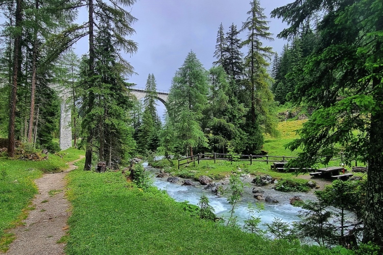 Die Strecke führt jetzt durch das liebliche Albula Tal. Immer wieder werden wir von der Rhätischen Bahn begleitet, die zum UNESCO-Welterbe zählt. Auch die Sonne lässt sich jetzt zwischendurch immer mal wieder blicken.