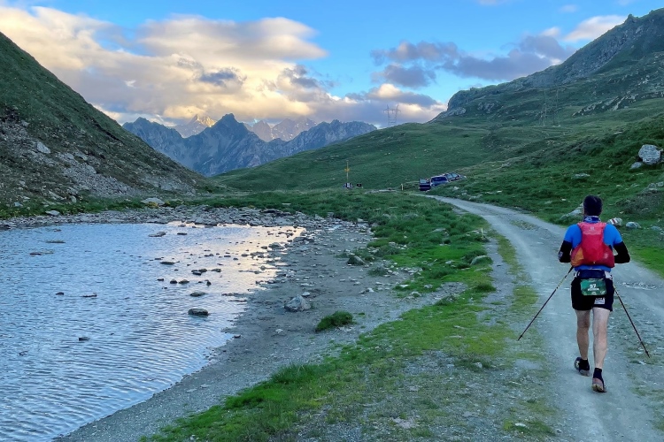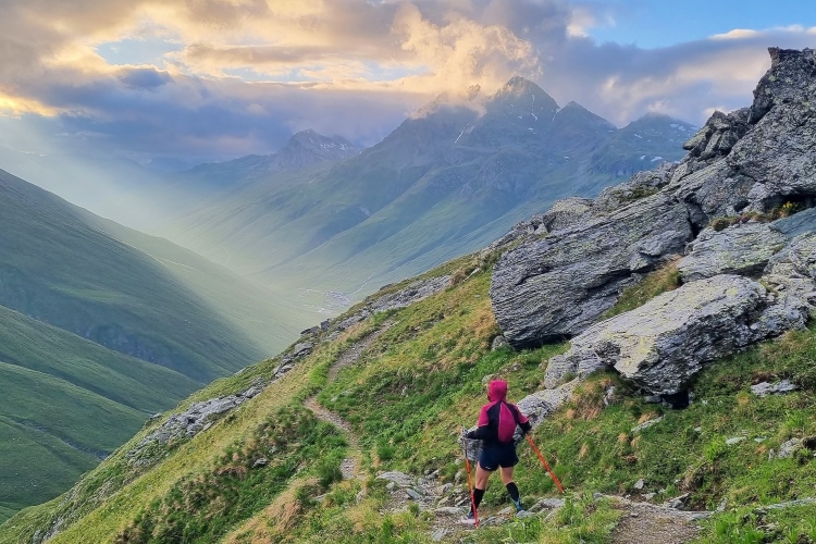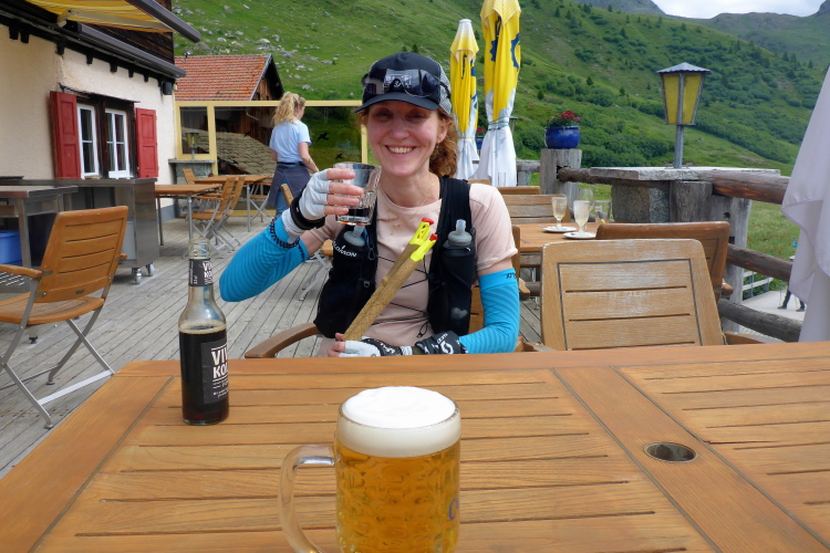 Bei Kilometer 37 erreichen wir die nächste Verpflegung. Außer ein paar Melonenstückchen und Wasser gibt es nur die Riegel des Sponsors. Schade. Ich vermisse die sonst in der Schweiz so üppige Verpflegung mit Käse und Bündner Fleisch. Immerhin gibt es einen Schluck Cola. Aber nur einen. Wir liegen gut in der Zeit. Noch zwei Stunden bis zum Cutoff. Die Sonne hat jetzt Oberhand. Schnell erreichen die Scharte Falotta und die nächste Verpflegung, die aus ein paar Wasserflaschen besteht. Wir nehmen lieber in der Hütte eine Cola und ein isotonisches Getränk, bevor es in den nächsten Aufstieg geht. Immerhin haben wir schon mehr als die Hälfte der Höhenmeter. Aber der Abstieg nach Bivio ist heftig. Meine nassen Socken bescheren mir eine Blase. Ich hätte gleich anhalten sollen, aber wollte dann doch lieber warten bis zum Dropbag, das in Bivio auf uns wartet. Anfängerfehler.