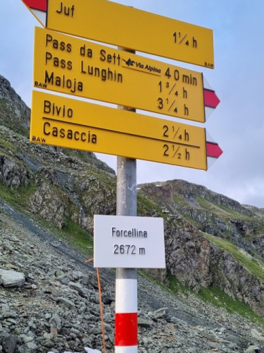 Am Ortseingang empfängt uns Florian, unser Supporter. Wir werden von Andrea Tuffli persönlich begrüßt. Ich vergesse ganz zu fotografieren und habe nur noch die leckeren Nudeln im Sinn, die hier angeboten werden. Nach einer guten Portion geht es schon besser. Florian erzählt uns, dass Peer, Myriam und Paul schon eine halbe Stunde vor uns da waren. Peer hat wohl Knieprobleme, aber die beiden anderen sind wohlauf. Wir wechseln die Schuhe und machen uns dann auch gleich auf den Weg. Es geht auf einen 20 Kilometer langen Loop zum Septimerpass, dann über Forcellina und den Fuorcla da la Valletta zurück nach Bivio. Es ist der Streckenabschnitt, der wegen der aggressiven Mutterkühe gekürzt werden musste.