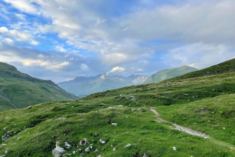 In Sur fülle ich meine Flaschen auf. Leider gibt es keinen Käse oder Wurst. Das süße Zeug bekomme ich nicht mehr herunter. Egal. Letzter Anstieg. Es geht nochmal 600 Meter hoch zur Alp Tscharnoz. Ich schnaufe wie eine Dampflok der Rhätischen Bahn. Ich weiß nicht mehr, wie ich auf den Wurzelwegen auftreten soll. Die Blase am Fuß füllt sich immer wieder mit Flüssigkeit. Ab und zu merke ich dann, wie der Druck wieder nachlässt. Dann der letzte Downhill nach .Savognin. 800 Meter geht es auf den letzten fünf Kilometern nochmal in die Tiefe