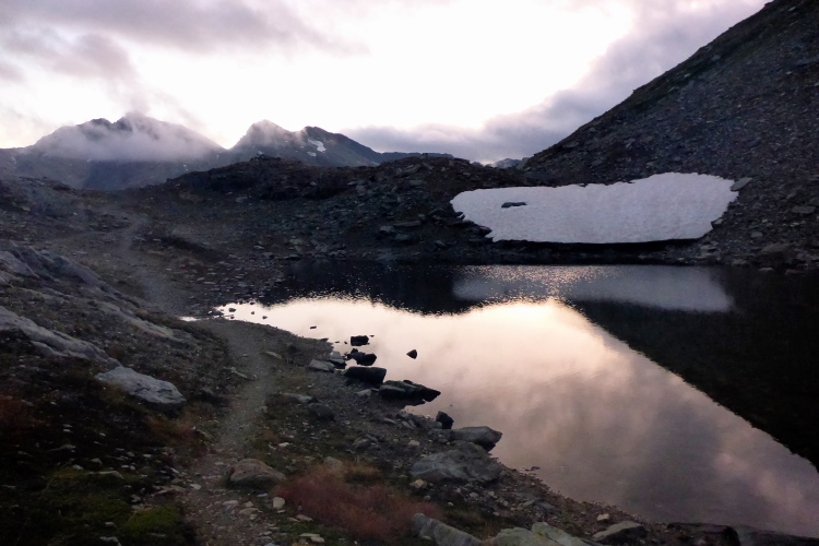 In Naz erreichen wir die nächste Verpflegung und werden mit Glockengeläut empfangen. Der anschließende Fahrweg endet bald und weiter geht es entlang eines Bachlaufes. Schnell erreichen wir die Baumgrenze. Bach und Trail sind nicht immer sauber zu trennen. Wir sind wieder in den Wolken. Blockwerk und Schneefelder wechseln sich ab. 1500 Höhenmeter sind von Bergün bis zum Fuorcla da Tschitta zu bewältigen. Schade, dass wir die meiste Zeit in einer trüben Suppe unterwegs sind. Erst beim Abstieg gibt die Sonne ein paar schöne Ausblicke auf die majestätische Bergwelt frei. Ein paar Altschneefelder sind zu queren. Insgesamt ist sehr viel Wasser auf der Strecke.