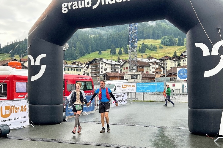 Mit der Dämmerung lässt auch der Regen nach. Ich packe Stirnlampe und Jacke weg. Wir erkennen unter uns bereits Savognin. Ein Läufer, den wir hinter Bivio überholt hatten, zieht an uns vorbei. Wir traben langsam den jetzt beginnenden Fahrweg hinab und sind froh, dass wir endlich das Ziel in greifbarer Nähe haben. Florian empfängt uns am Zielbogen. Sechundzwanzigeinhalb Stunden waren wir unterwegs, bei einem Cutoff von 30 Stunden. Statt einer Medaille gibt es ein Stirnband und eine Dose Alkoholfreies Bier. Viele Läuferinnen und Läufer sind nicht mehr auf der Strecke. Sie haben in Bivio aufgegeben. Birgit ist stolz auf ihren ersten 100er. Das kann sie sein. Sie hat sich dafür ein wahrhaft hartes Brett ausgesucht.