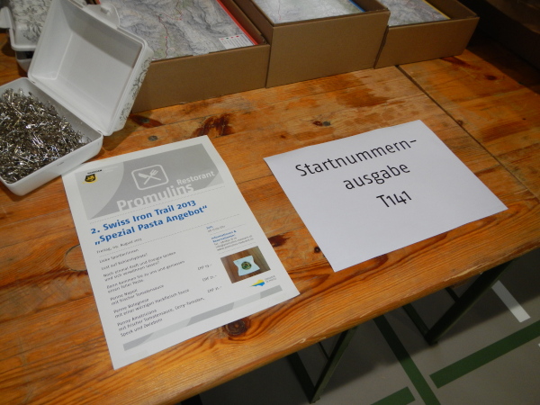 Nach einem Nachtessen im gleichnamigen Restaurant, während dem wir uns ein paar Mal an die Fensterfront begeben , um einem vorbeiziehenden T201-Läufer die Aufwartung zu machen, hole ich die Startunterlagen und bereite die Dropbags zur Abgabe vor.