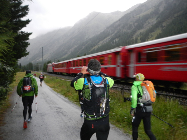 In verhaltenem Tempo zieht die kleine, mit nur drei Läuferinnen durchsetzte Läuferkarawane hinein ins Bevertal, entlang der Albulabahnlinie, einem UNESCO Weltkulturerbe. Nach sieben Kilometern gibt es bei der Alp Spinas zu trinken, und während rechterhand die Bahnreisenden jeweils vom plötzlichen Dunkel  des Albulatunnels verschluckt werden, entschwinden wir in die sich langsam über uns senkende Nacht.  Noch etwas weiter hinten im Tal ist Palüd Marscha, von wo aus der Übergang ins Albulatal in Angriff genommen wird.