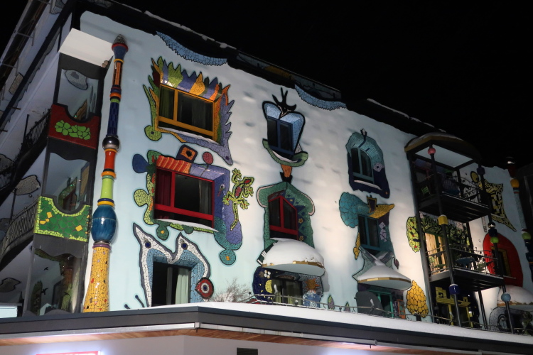 Als Intro wartet eine Seerunde auf uns. Auf dem geräumten Promenadenweg geht es dahin. Schnell zieht sich der Pulk auseinander und bewegt sich in einer immer länger werdenden Schlange um den See. Vorbei geht es am Hotel Lindemann´s mit seiner markanten Fassade im Hundertwasser-Stil und am Bahnhof, wo schon die schaurig gewandeten Guggenmusiker der Städtlischränzer aus Sargans auf den Einsatz warten. Ein kurzes Stück folgen wir einer schneebedeckten Uferstraße, der einzigen asphaltierten Passage des Kurses.