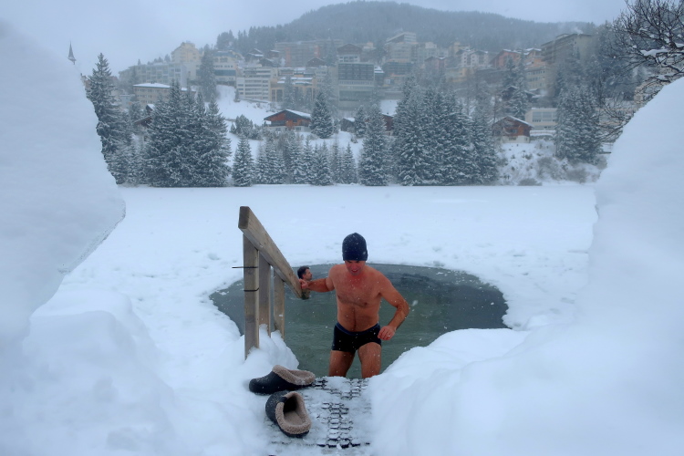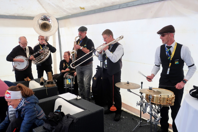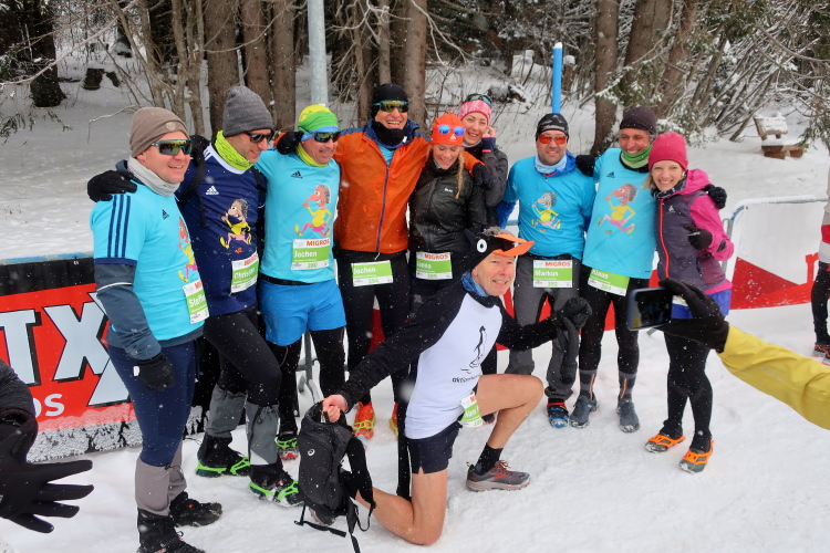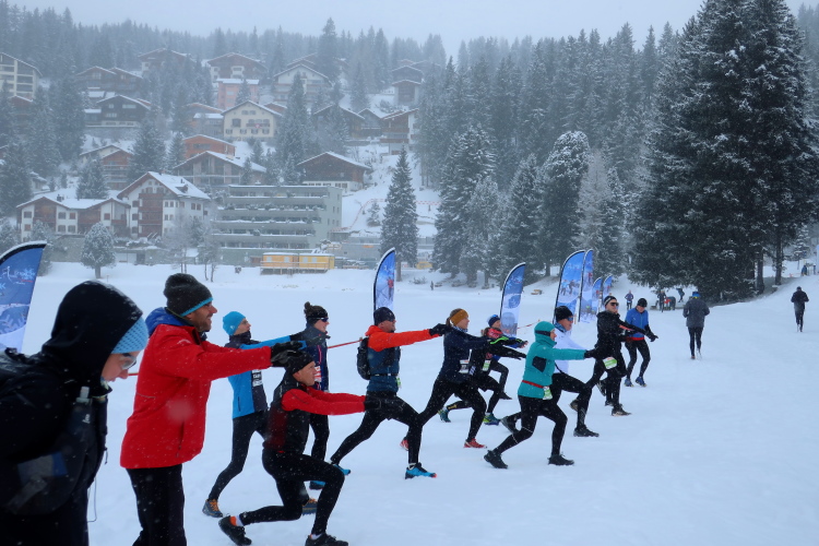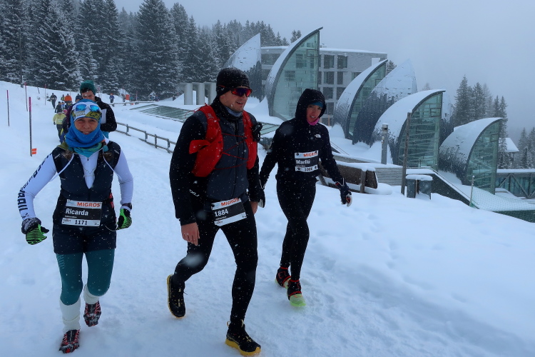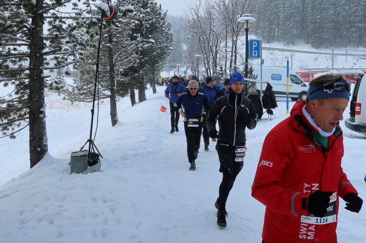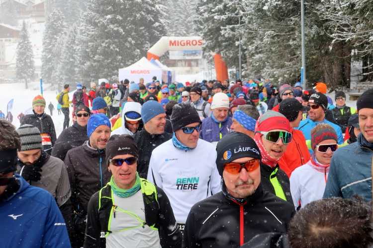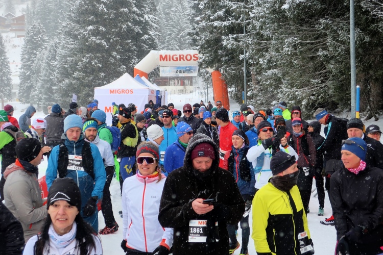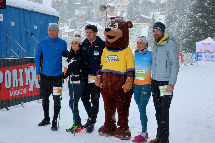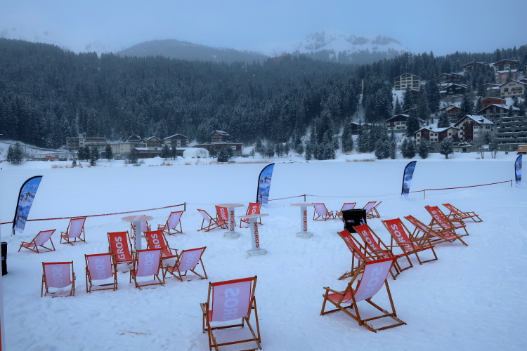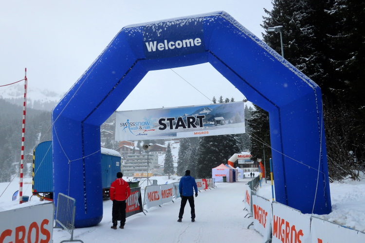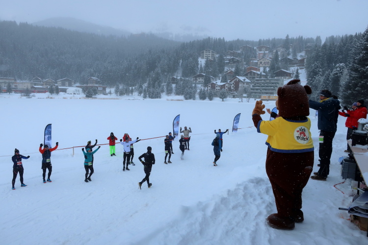 Nur ein paar Schritte sind es von hier zum Oval des Obersees, knappe 400 Meter lang und 250 Meter breit. Herrlich ist die Kulisse der schneebedeckten Berge rund um den komplett zugefrorenen See. In dieser Idylle angelegt ist das Start- und Zielareal. Blau und rot leuchten Start- und Zielbogen, wehen bunte Fahnen am Seeufer, warten zahlreiche Liegestühle - vergeblich - auf Erholungsuchende. Der Andrang hält sich angesichts Außentemperaturen von sibirisch anmutenden minus zwölf Grad Celsius und reichlich Schneefall - zunächst - in Grenzen. Das Kongresszentrum findet als warme Wartehalle mehr Anklang. Ich habe das Glück, im kuschelig warmen VIP-Zelt Unterschlupf zu finden und den schwarzgewandeten Bläsern der Jazzgruppe 2Step4Fun bei ihrem ersten Ständchen zu lauschen. Außerhalb der Schutzräume ist permanente Bewegung unbedingt geboten, um nicht auszukühlen. So ist der kollektive gymnastische Warm Up zu flotter Musik vom Band, angeleitet vom obligatorischen Team aus der Schweizer „Bachelor“-Szene, mehr als nur ein netter Showteil.