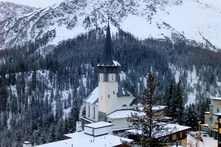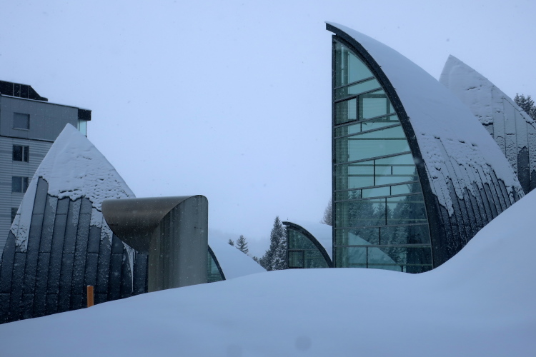 Aus dem Wald heraustretend passieren wir zunächst oberhalb das Tschuggen Grand Hotel, einen der Fünfsterne-Tempel Arosas. Ein „Eyecatcher“ sind die Lichttürme der von Stararchitekt Mario Botta geschaffenen „Bergoase“. Gleich Segeln aus Stahl und Glas ragen die oberirdischen Elemente des extravagant gestalteten Spa-Bereichs des Hotels aus der verschneiten Natur. Wenn es dunkel wird und diese Segel von innen verschiedenfarbig ausgeleuchtet sind, hat man gänzlich das Gefühl, im outer space zu sein. Etwa 1.000 SFR/ Nacht kostet hier das einfachste Doppelzimmer. Immerhin mit Frühstück, exklusivem Zugang zu besagtem Wellnesstempel und hauseigenem Bergbahn-“Coaster“ ins Skigebiet hinein.