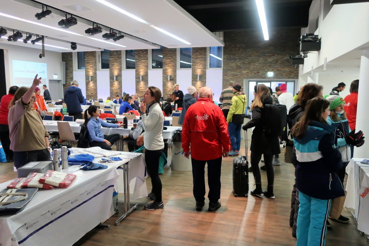 Ein klassisches Ortszentrum gibt es in Arosa nicht. Eine zentrale Rolle nimmt jedoch der Obersee ein. An seinem Ufer endet die von Chur heraufführende Schmalspurbahn, hier findet man Geschäfte und Restaurants, warten Kutscher und Taxis auf Gäste. Und hier ist auch das Sport- und Kongresszentrum Arosas. Dessen Besuch ist für Nichtschweizer ein Pflichttermin. Während die eidgenössischen Teilnehmer die Startnummer vorab per Post zugeschickt bekommen, müssen alle anderen diese hier am Lauftag vor dem Start abholen. Macht nichts: Das geht ganz fix und so habe ich gleich die Gelegenheit, den Kongresssaal als schon bestens präparierte Location für die „After Snow Party“ in Augenschein zu nehmen.