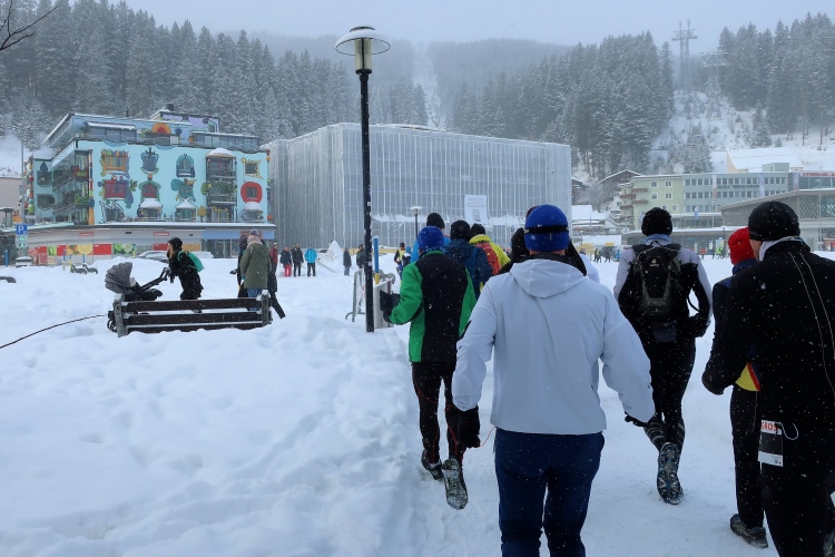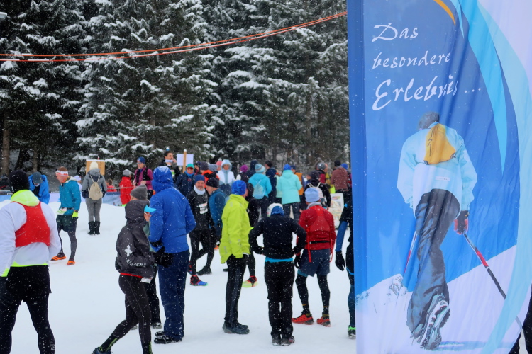 Ab halb elf wird das Gewimmel der sportiv-winterlich gewandeten Läufer rund um den Startbogen schnell größer. Overall knapp 1.100 Teilnehmer sind gemeldet und als erste dürfen die etwa zweihundert verhinderten Snowtrailer „ran“. Das lasse ich mir fotografisch nicht entgehen. Eine Schneedusche erwartet die Starter der ersten Reihe, als sich mit dem Startschuss um 10:40 Uhr der auf dem Startbogen gesammelte Schnee löst. Nett anzuschauen, aber auch der Rest der Wartenden wird mit reichlich weißen Flocken vom Himmel bedacht.
