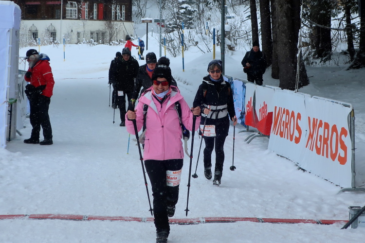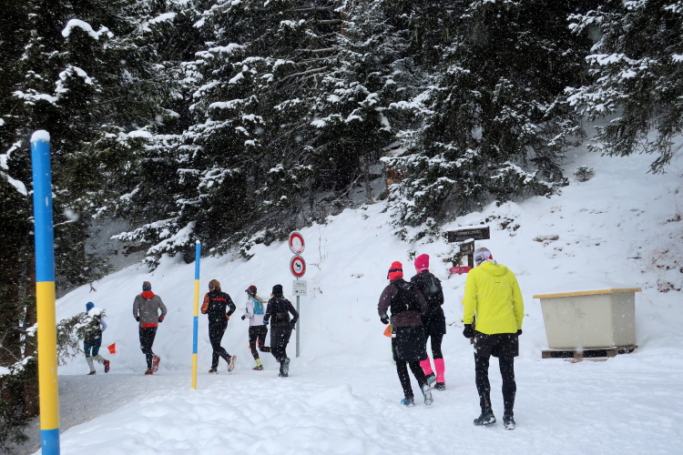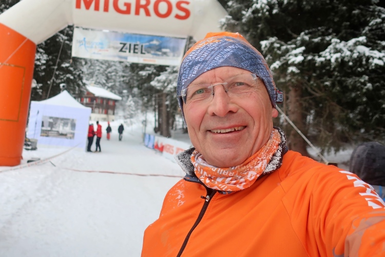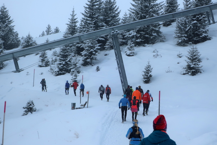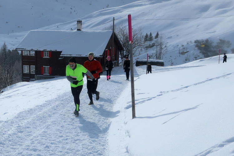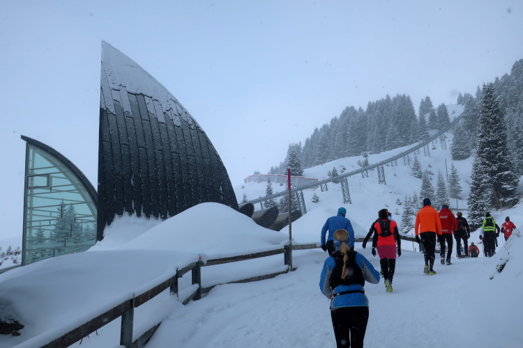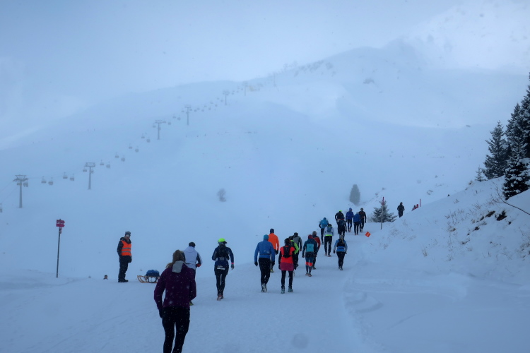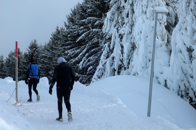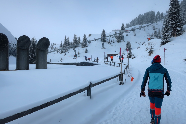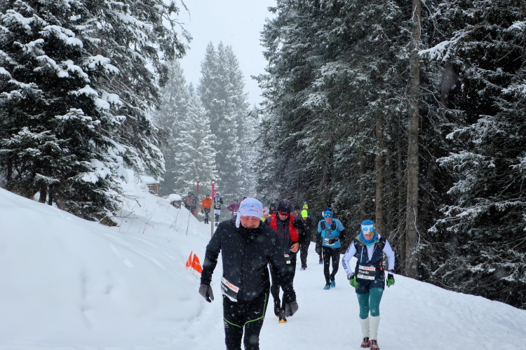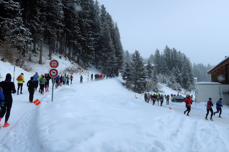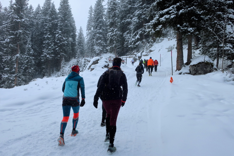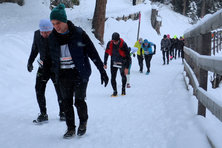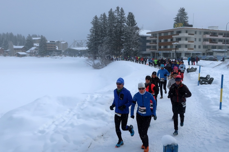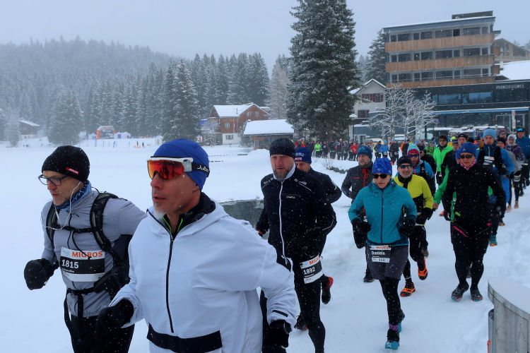 Zu drei Vierteln ist der See umrundet und der erste Kilometer knapp bewältigt, als wir erstmals höhenmetermäßig geprüft werden, wenn auch nur ein bisschen. Die „Pumpe“ hat dennoch reichlich zu tun. Via Seehalden- und Rainweg werden wir im Zickzack den Hang hinauf auf 1.780 m üNN gelotst und folgen einem gut präparierten, nur leicht ansteigenden Wanderweg durch dichten Nadelwald. Herrlich zu laufen ist es hier. Zwischen den tief verschneiten Bäumen erlauben uns Schneisen immer wieder kurze Ausblicke auf den unter uns liegenden Obersee und das ferne Startgelände. Selbst bis hier oben dröhnen die Geräusche der weiteren Startkommandos.