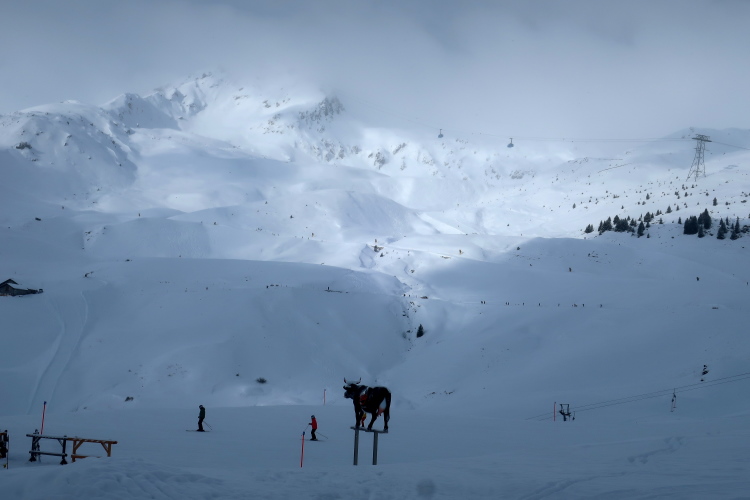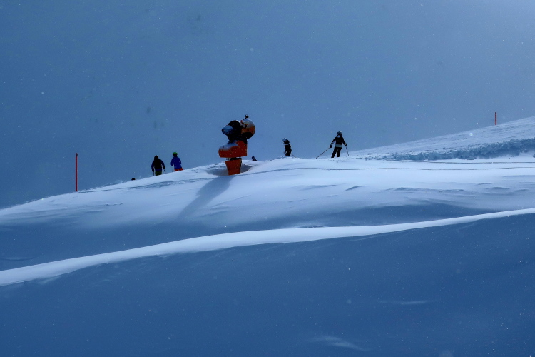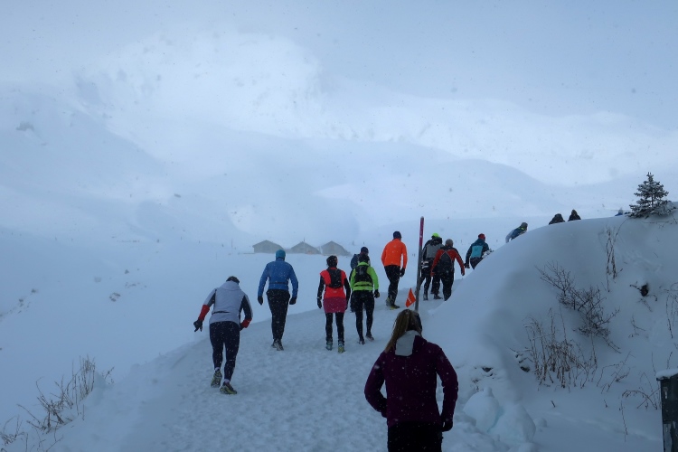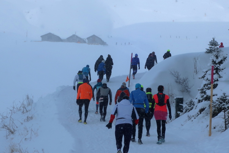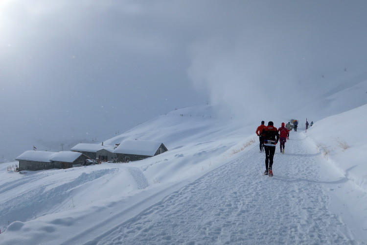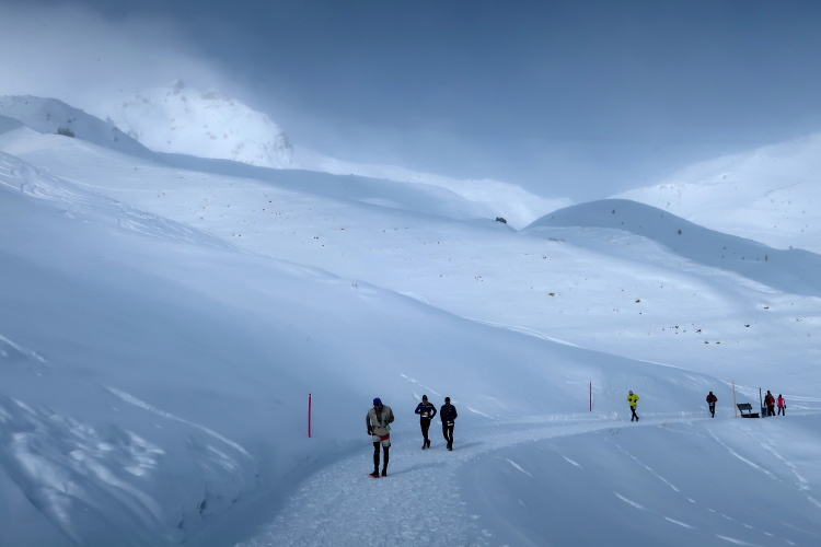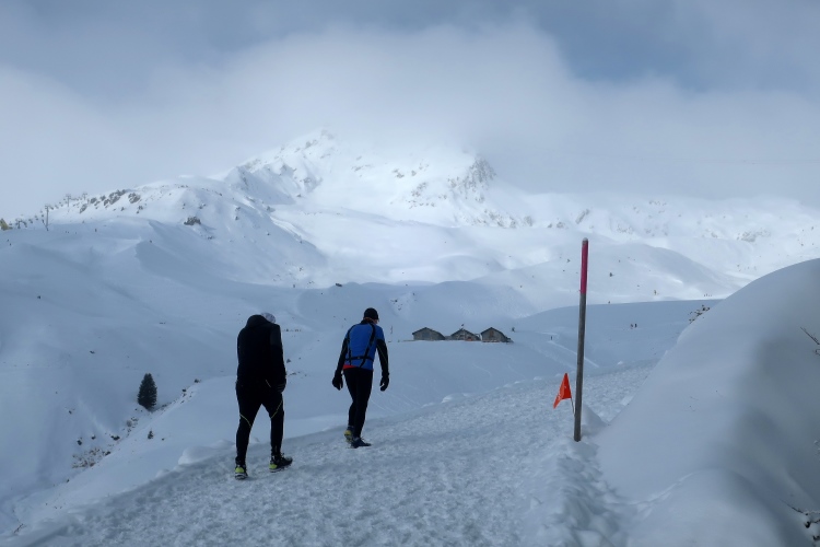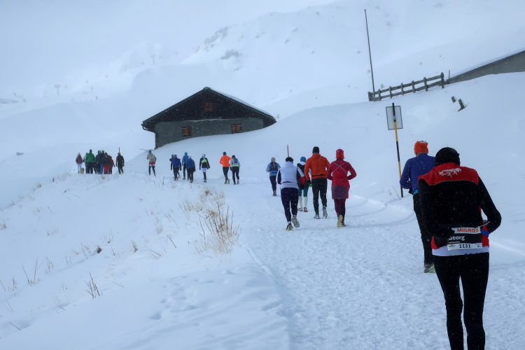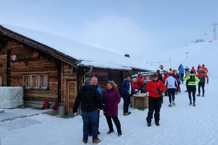 Nur zögerlich erschließt sich uns die Weite der Bergwelt. Dichte graue Schneewolken verhängen die Kulisse und blasen uns die Flocken ins Gesicht. Einem steilen, wenn auch gut präparierten Serpentinenweg folgend erobern wir die nächsten 150 Höhenmeter. Mit zunehmender Höhe lüftet sich jedoch der Schleier der Wolken. Mächtig türmt sich vor uns die noch blasse monolithische Silhouette des Weißhorns auf, durchschneiden Liftanlagen die grauweiße Wand am Horizont und flitzen kleine Punkte durch eben jene Wand. So richtig auf Tuchfühlung zu den skifahrenden und boardenden Pistenhelden kommen wir aber erst nach etwa 5,5 km kurz vor der 2000 m-Höhenmarke. Hier lädt die rustikale Tschuggenhütte (1.990 m üNN) bzw. die für uns davor postierte erste Verpflegungsstelle zum Verschnaufen und einen kurzen Stopp ein. Das gewärmte Wasser tut gut.