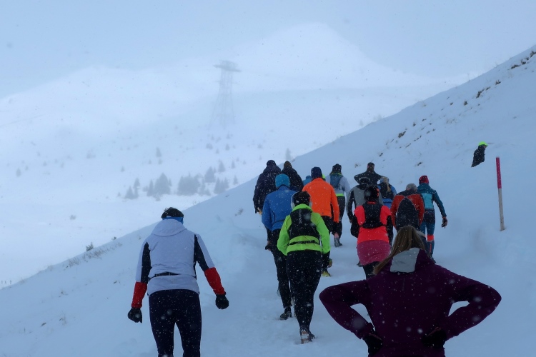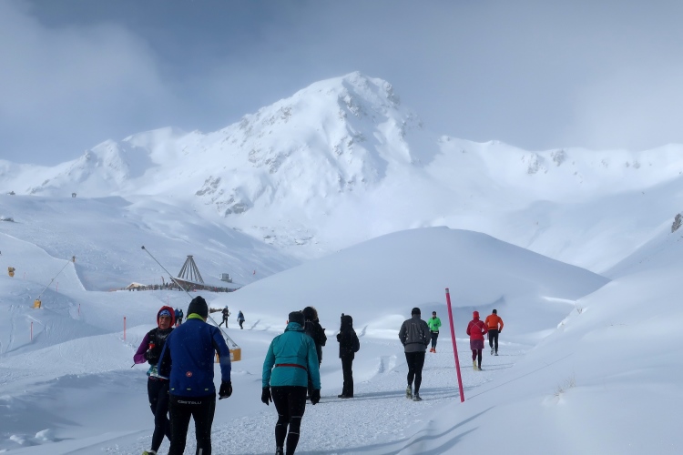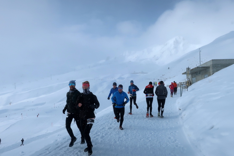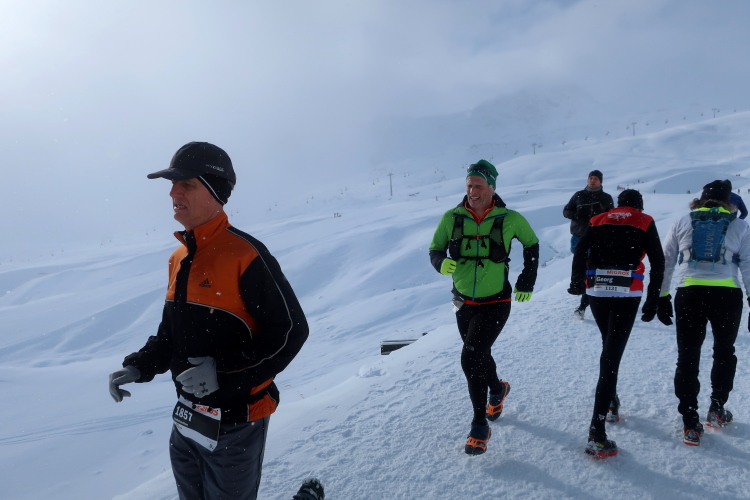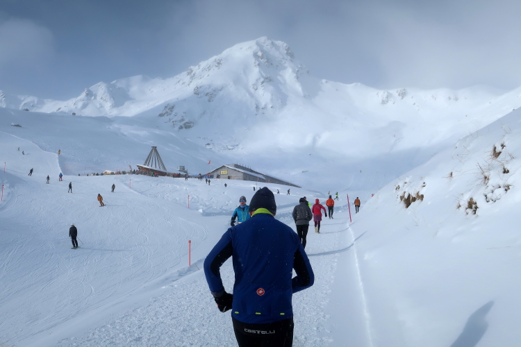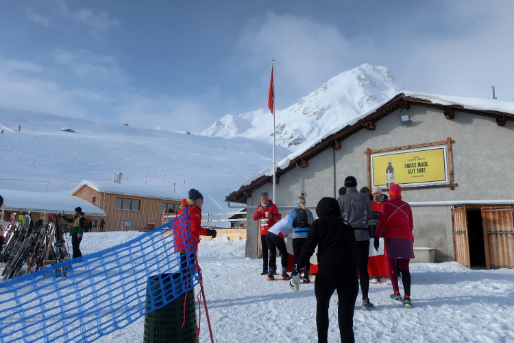 Acht Kilometer sind geschafft, und ich bin es auch ein wenig, als ich den Verpflegungspunkt direkt vor der Bar erreiche. Hunderte aufgereihter Skier und Boards zeugen von der Beliebtheit der Location. Einmal mehr ziehe ich das warme Wasser dem eiskalten Isodrink vor, genieße ein paar Momente das Gefühl, den längsten und größten Anstieg des Kurses bewältigt zu haben.
