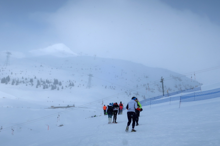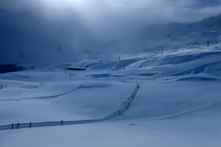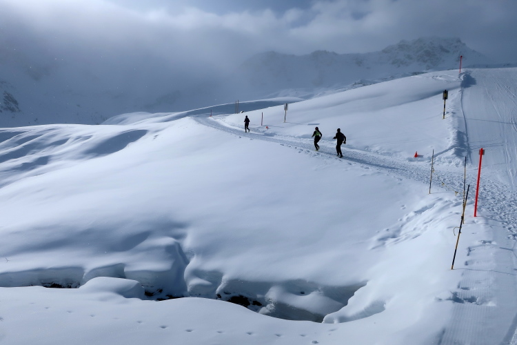 Downhill fühlt sich der Run durch den Schnee gleich viel besser an. Allzu gerne lasse ich mich dennoch von einem Fotostopp nach dem anderen ausbremsen, zu verlockend sind die Motive, insbesondere die Läuferkarawanen, die sich in den Weiten der Landschaft verlieren. Zurück auf dem Hauptweg setzt sich der Kurs westwärts weiterhin abwärts fort. Bis zum Horizont erschließen Liftanlagen das Gelände. Immer wieder sind von uns Skipisten zu queren und zeugen davon, wie weitläufig und großzügig dieses Wintersportgebiet angelegt ist.