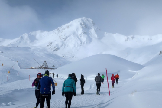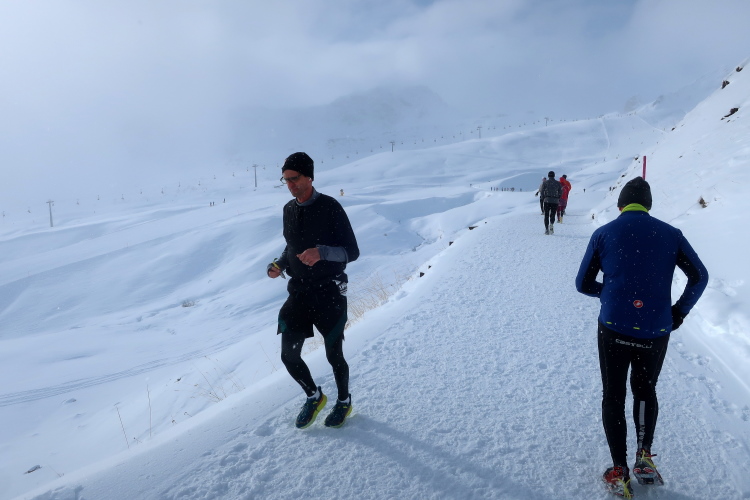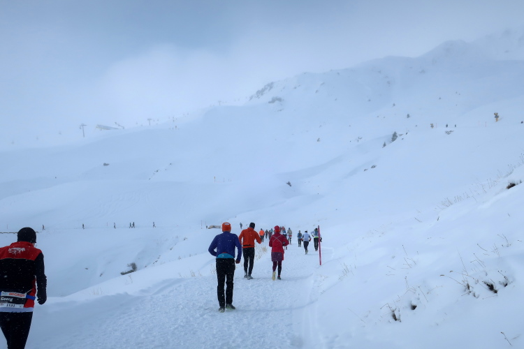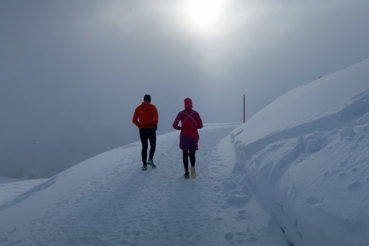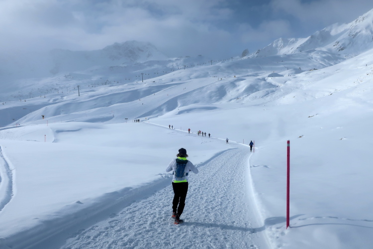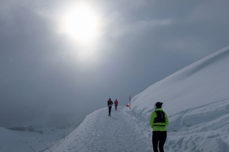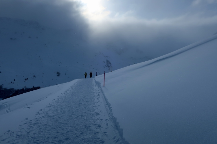 Ein breiter Wanderweg führt in leichtem Auf und Ab quer zum Hang durch das endlose Weiß und ermöglicht entspanntes Traben. Snowtrailen vom Feinsten ist das. Bei Kilometer 7 schwenkt der Kurs nach rechts auf eine Pendelpassage, der nun stärker ansteigend entlang der Plattenhornpisten durch die Landschaft nach oben mäandert, geradewegs in Richtung Weißhorn. Je höher wir kommen, desto prägnanter werden die Umrisse des Berges, weichen die Wolken, leuchtet sonnenbeschienen das Weiß nah und fern. Was für ein Anblick! Während mein Umfeld und ich eher walkend als laufend empor schleichen, kommen uns andere Läufer im dynamischen Bergabtrab entgegen. So traumhaft die Landschaft ist, so beneide ich sie doch.