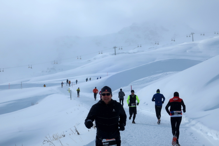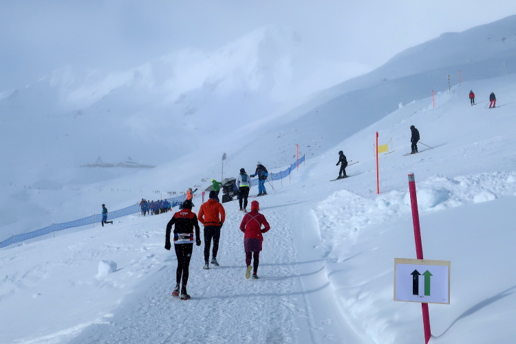 Nach 14,5 km erreiche ich mit der Tschuggenhütte bekanntes Terrain, schließt sich die Laufrunde durchs Reich der Skipisten. Einmal mehr willkommen ist der Warmwasserstopp, bevor wir neuerlich die LAW-Mittelstation ansteuern, nunmehr auf kürzestem Weg. Emsiger Seilbahnverkehr erwartet mich dort nach 15 km in 2.015 m Höhe. Und die Gewissheit: Der zweite Kulminationspunkt unseres Kurses ist erreicht. Ab hier geht es - fast - nur noch hinab.