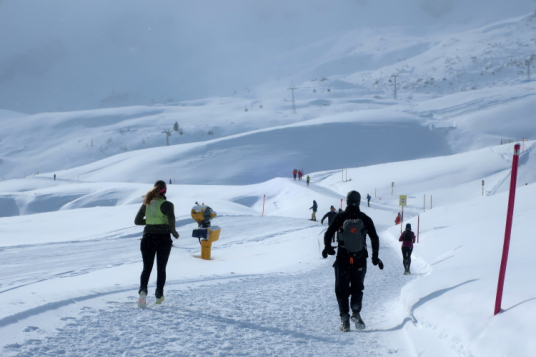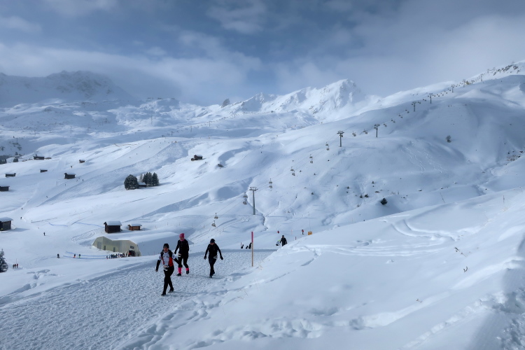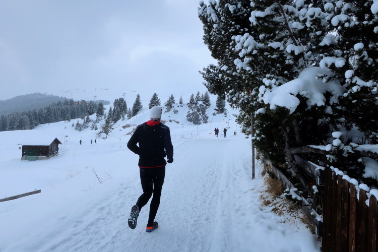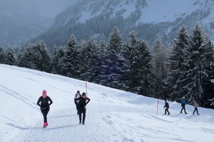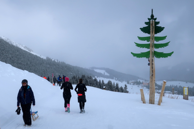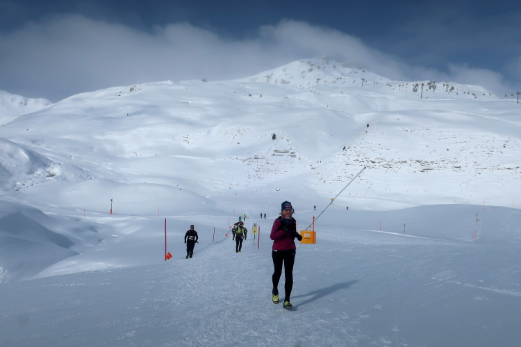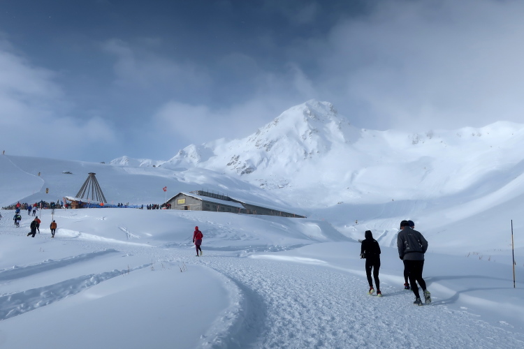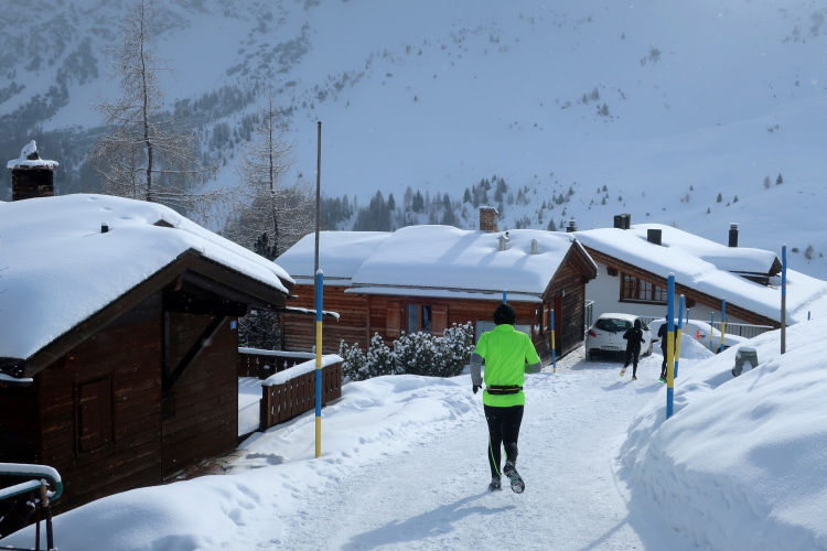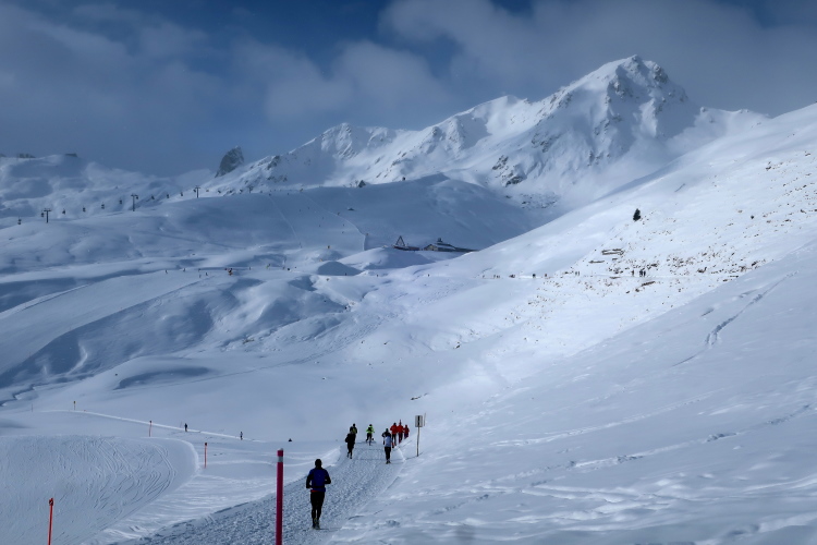 Auf breiten Wegen geht es entspannt weiter, entspannt vor allem deshalb, weil nur wenige Höhenmeter hinzukommen. Geradewegs auf die Mittelstation der Luftseilbahn Arosa Weisshorn, kurz „LAW“ genannt, halten wir zu. Skipisten und Wander- bzw. Laufwege kreuzen sich hier, aber Platz ist genug für alle in dem überaus übersichtlichen Gelände. In friedlicher Koexistenz huschen Skifahrer, Boarder, Winterwanderer und eben wir Läufer aneinander vorbei. Auf halbem Weg zur LAW markieren nach sechs Kilometern farbige Wegweiser die Route: Weiter geradeaus und dann in einer 10 km langen Ost-West-Schleife hinauf zum Gipfel ginge es für die Snowtrailer, aber eben nur „ginge“. Nach links und damit westwärts zweigt der Halbmarathonkurs ab, in Richtung der Carmennahütte, die den Peak der heutigen Strecke bildet.