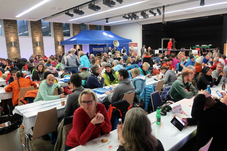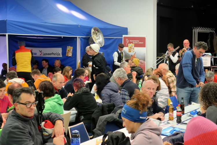 Ein weiteres Mal habe ich das Privileg, im kleinen beheizten VIP-Zelt zum Aufwärmen Unterschlupf zu finden. Ein frisch gebrühter Kaffee … einfach wunderbar. Dann eile ich jedoch weiter. Denn gefeiert wird woanders. Im proppenvollen Kongresssaal ist die „After Snow Party“, von Livemusik begleitet, schon längst im Gange. Die langen Tischreihen sind voll besetzt. Reichlich Speis und Trank, von herzhaft bis süß, wird angeboten, Erinnerungsaccessoires obendrauf. Und wer es gerne „klassisch“ mag, bekommt auch einen Teller Pasta. Ein schöner und stimmungsvoller Ausklang für dieses sehr besondere und erlebnisreiche Laufevent. Und einmal mehr darf ich für mich feststellen: Die Faszination „Winterlauf“ lässt sich wohl nirgendwo mental so nachhaltig erleben wie hier in Arosa.