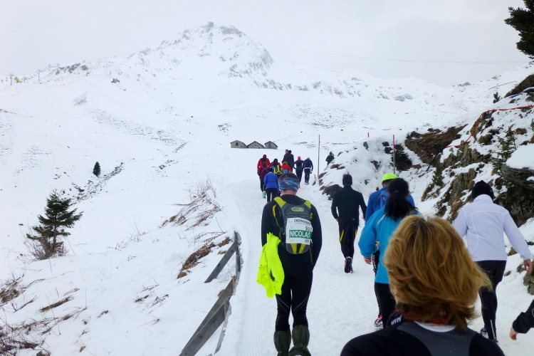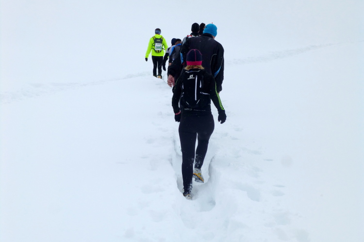 Sogleich steil geht es durch dicken, von den vorangehenden Läufern durchpflügten Schnee bergan. Und sogleich merkt man: Das ist ein ganz neues Erlebnis von Anstrengung. Zudem ist jeder Schritt mit Bedacht zu machen. Leicht kann man umknicken oder wadentief abseits des „ausgetretenen“ Pfads versinken. Selbst da, wo es keine Steigungen gibt, ist an laufen nicht mehr zu denken. Mehr als „Power-Walking“ ist nicht mehr drin.
