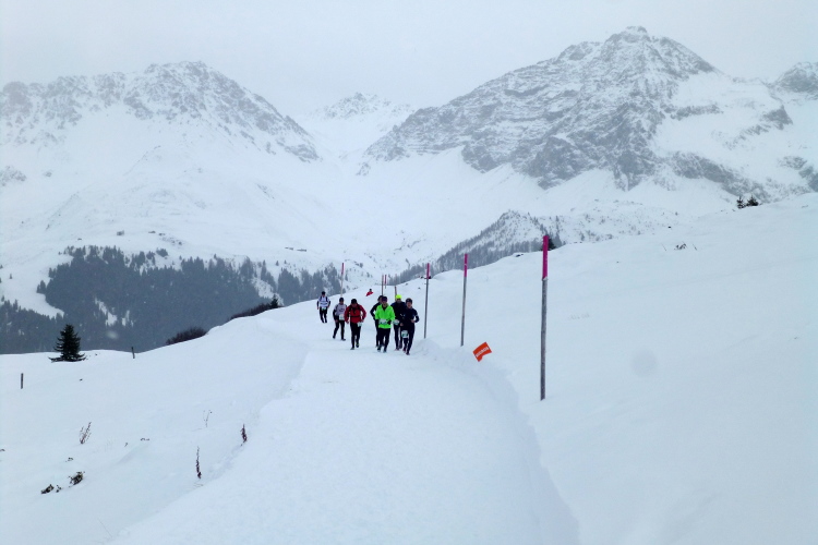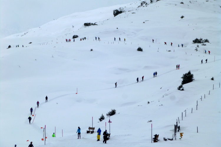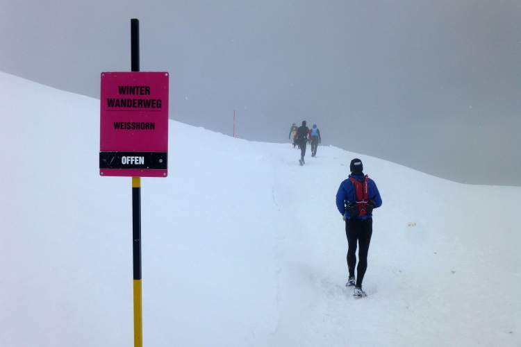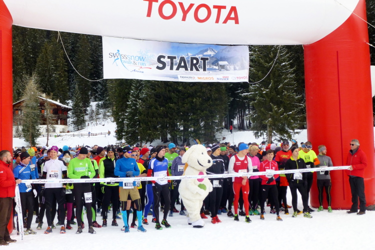 Wer sich in Arosa läuferisch austoben will, hat allerhand Alternativen. Mit Start und Ziel in Arosa stehen beim "swiss snow walk & run", wie sich die Veranstaltung offiziell nennt, Distanzen zwischen 6,1 und 21,1 km durch die umgebende Bergwelt zur Auswahl. Ein ausgedehntes Netz von Winterwanderwegen macht es möglich. Weiterhin wählen kann man, diese Distanzen als Läufer, Nordic Walker oder "unbewaffneter" Walker zu bewältigen. Über 6,1 und 12 km wird gar als eigene Kategorie "Schneeschuhlaufen" angeboten. Hinzu kommt, neu im Programm, der Weisshorn Snowtrail, der nach dem Start in Arosa über 16,8 km auf den Gipfel des Weisshorns in 2.653 m üNN Höhe führt und dort endet. Wer als Marathonläufer denken mag, das seien doch alles "Kurzdistanzen", dem sei schon an dieser Stelle gesagt: Das Laufen auf Schnee ist zwar wunderschön, aber auch anstrengender als auf "normalem" Belag.