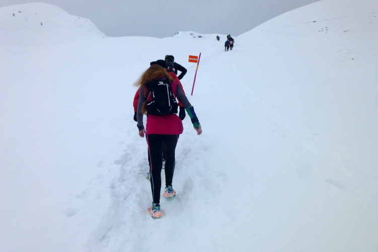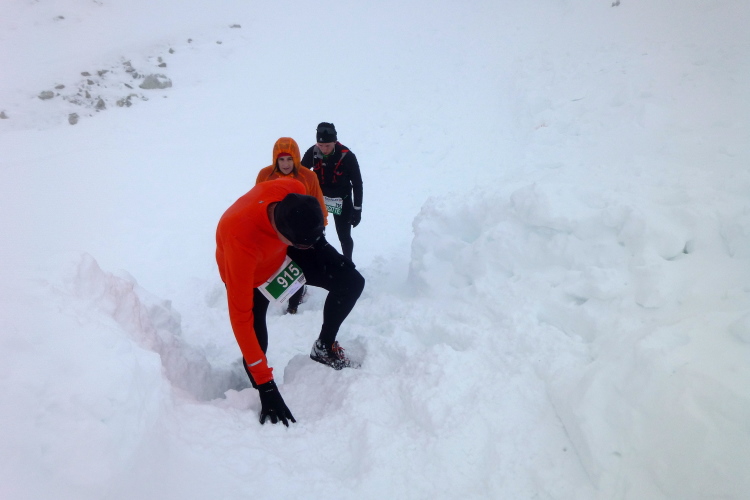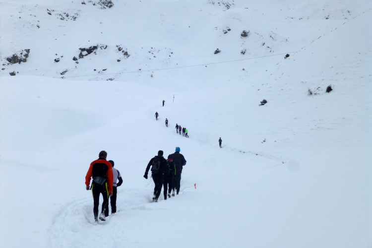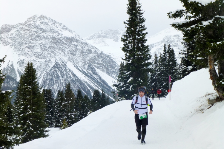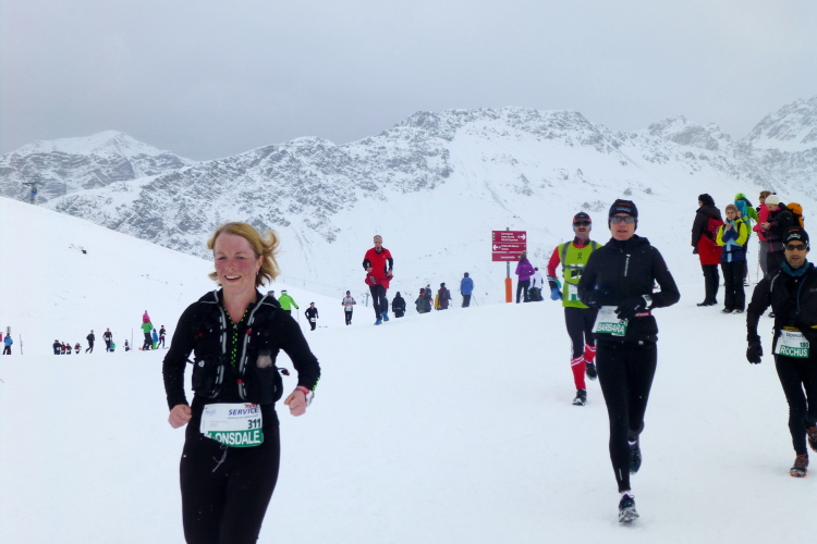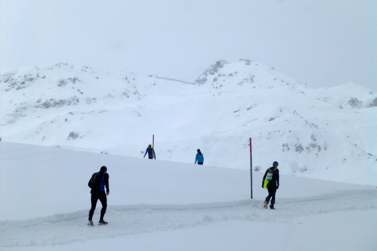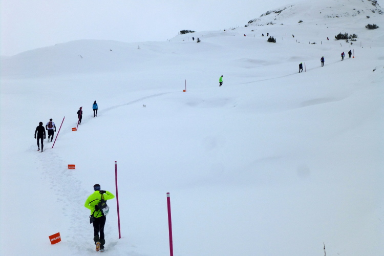 Langsamer, aber noch immer im Laufschritt geht es durch die Bergwelt. Immer karger wird die Vegetation, immer weiter reichen die makellosen Schneeflächen. Mehr denn je bringt das Weiß des Schnees die Konturen des tiefgrauen Felses der umliegenden Berge zum Vorschein – ein fantastisches Bild. Die einzigen Farbtupfer in dieser Welt aus weiß-grau-schwarz sind Läufer mit ihren bunten Jacken.
