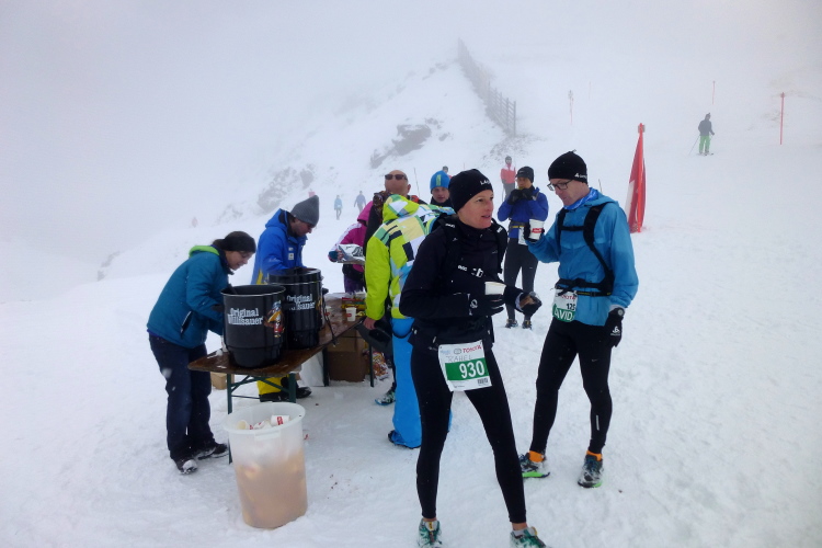Wie eine Oase kommt mir die Sattelhütte vor, deren schemenhaften Umrisse ich nach 15 km erspähe. Hier, auf 2.400 m üNN, gibt es, 1,8 km vor dem Ziel nochmals Verpflegung. Oh, tut das gut, heißes Rivella durch die Kehle zu gießen. Ich merke förmlich, wie die Wärme aus meinem Innern ausstrahlt. Und Kraft und Zuversicht wiederkehren. Die brauche ich auch: Noch immer trennen mich 250 Höhenmeter vom Gipfel.