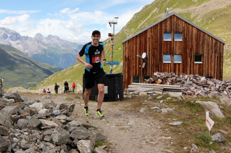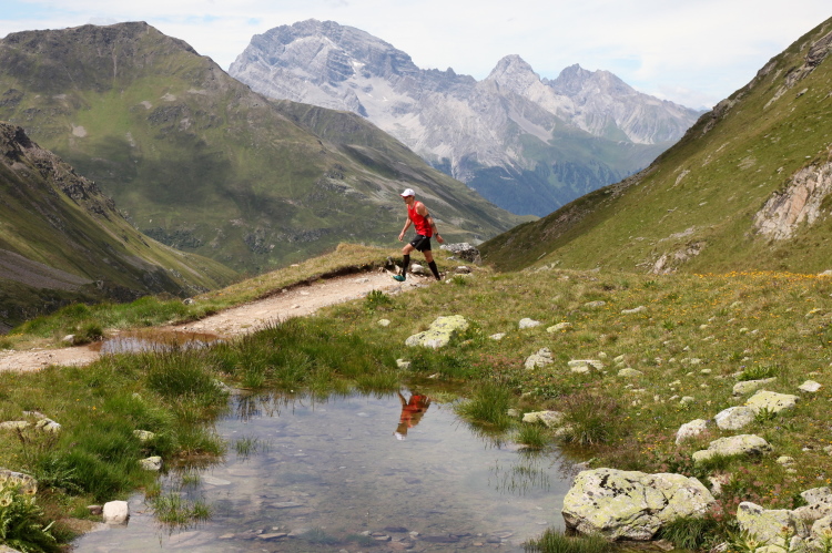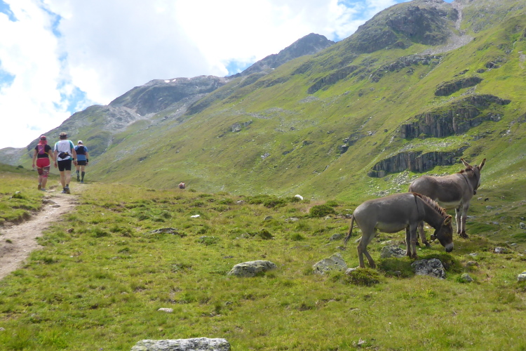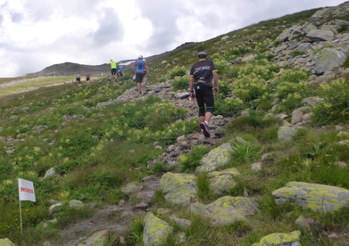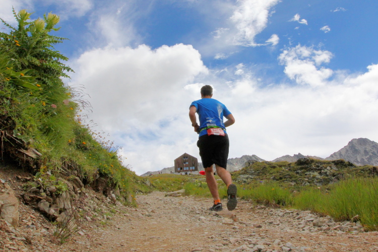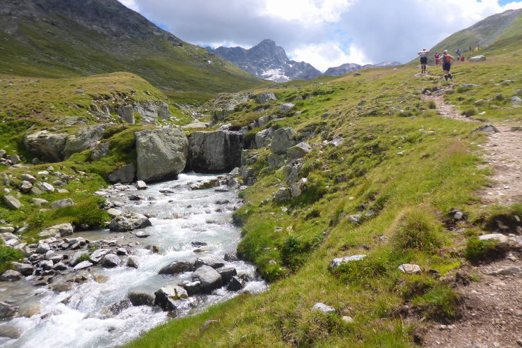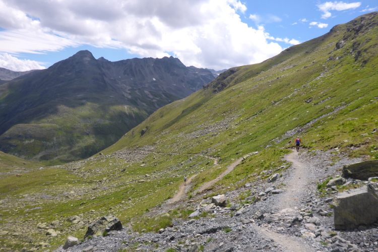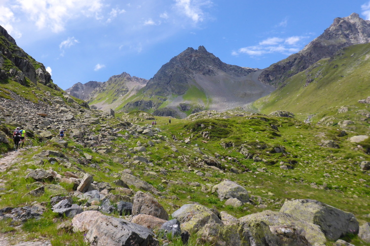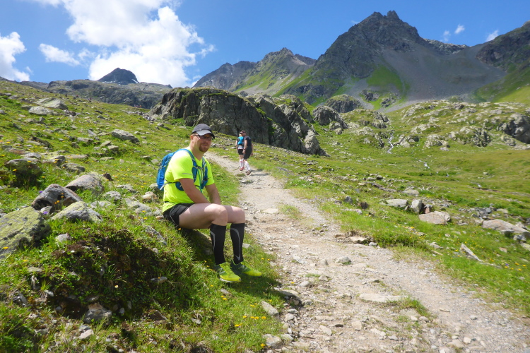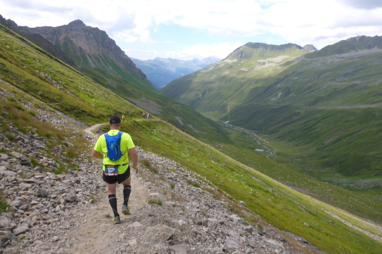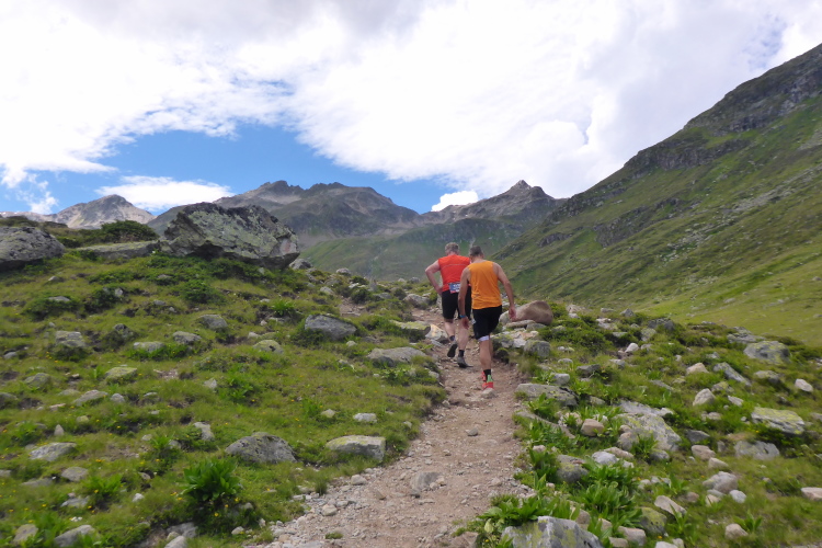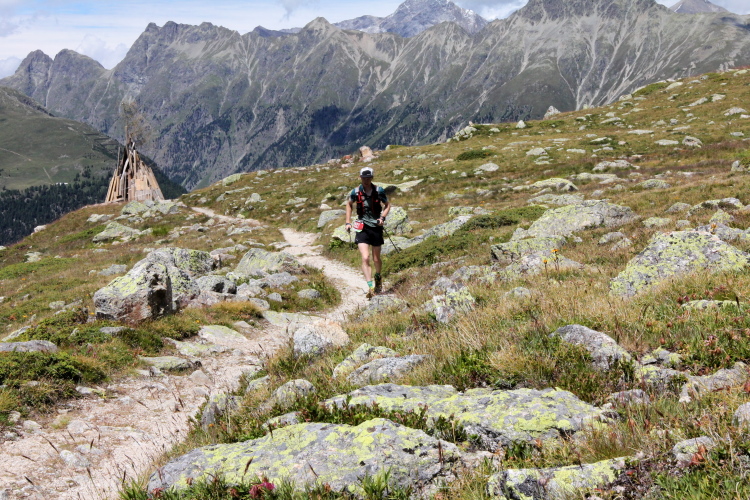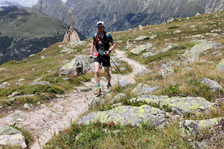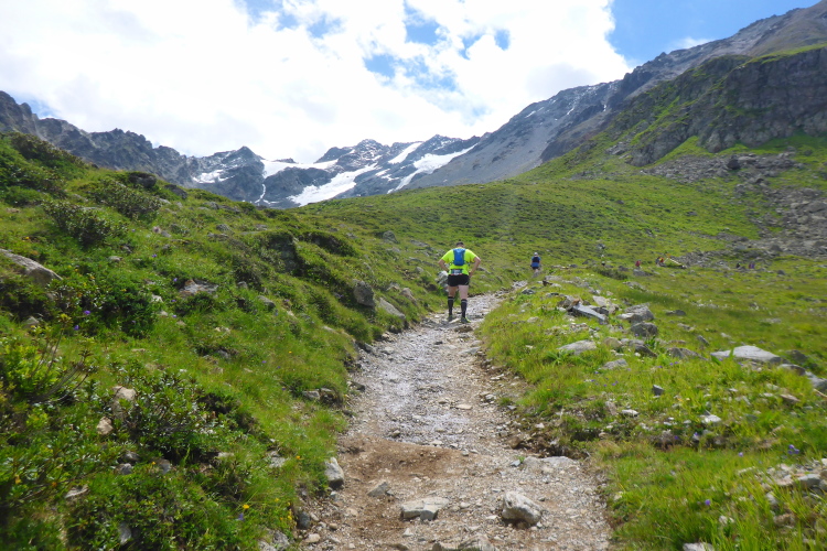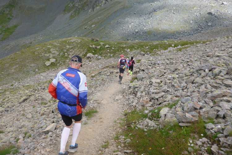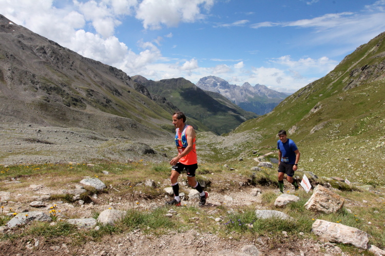 Ein langgezogener Links- und dann Rechtsbogen bringt mich endgültig in hochalpines Gelände (30 km noch zu laufen). Waren bisher blühende Almwiesen um mich herum, wird es nun steinig und steil. Mit Yves habe ich einen tollen Begleiter gefunden. Wir haben gleich ein interessantes Gesprächsthema und gelangen so gemeinsam schnell nach oben. Hier, bei der Hütte auf dem Scalettapass, gab es letztes Jahr ebenfalls eine VP. Yves kämpft mit Krämpfen und muss auf einer Bank pausieren. Ich lasse ihn zurück und mache ich mich auf den Weg nach unten.