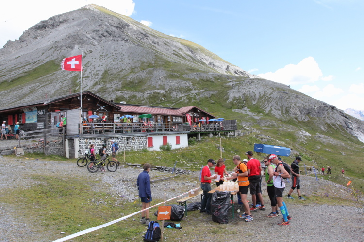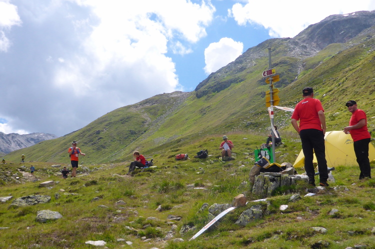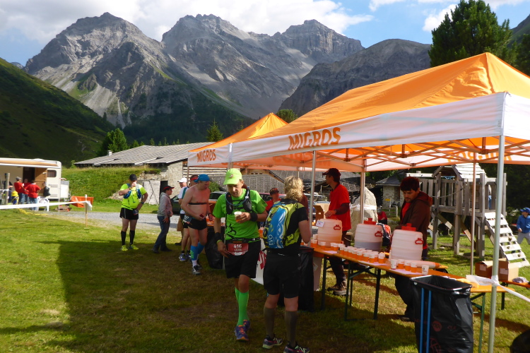 Hier gibt es Müsliriegel und Tee. Ich setzte mich etwas abseits auf einen Stein und resümiere: Ich bin nun über 4 Stunden unterwegs und hab noch nicht einmal die Hälfte der Strecke. Es ist immer noch sehr warm und jetzt muss ich sämtliche verlorenen Höhenmeter wieder gutmachen. Vom anschließenden Aufstieg auf den Sertigpass ganz zu schweigen. Ob ich das bis zum Cutoff um 18 Uhr 40 in Sertig Dörfli schaffen werde?