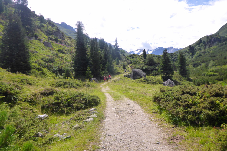Ein lauschiger Wanderweg führt zwischen mannshohen Bergkiefern und anderen Büschen hindurch. Blau blühen wilde Glockenblumen und Rittersporn, gelbe und rote Blumen bilden deutliche Farbakzente, Kuhglocken sind zu hören - Idylle pur. Dass oberhalb die Straße läuft, nehmen wir kaum wahr.
