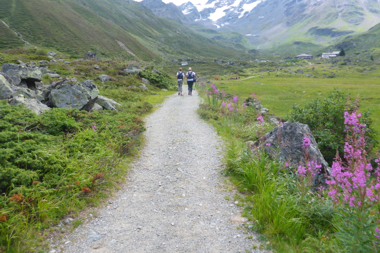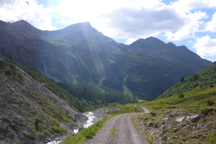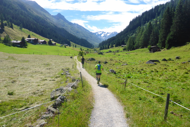 Derart motiviert werden wir fünf Minuten später, genau um 10 Uhr, auf die Strecke geschickt. Hin und wieder feuern uns ein paar Zuschauer an. Jetzt geht es ins Dischmatal, dem mittleren der drei Seitentäler südlich von Davos. Der Weg führt durch grüne Wiesen, wellig, tendenziell bergauf. Ich freue mich an der blühenden Pracht und versuche mein Tempo zu finden. Nur nicht zu schnell angehen. In der Ferne baut sich bereits der Scalettagletscher vor uns auf.