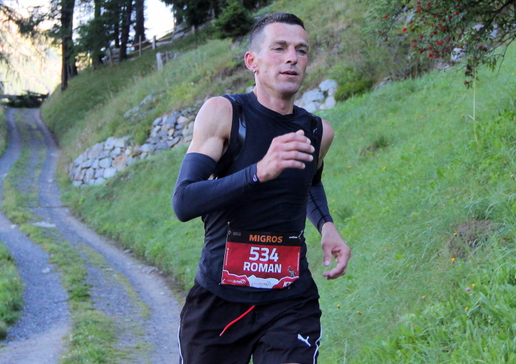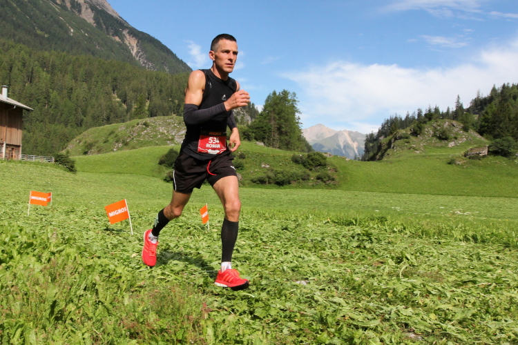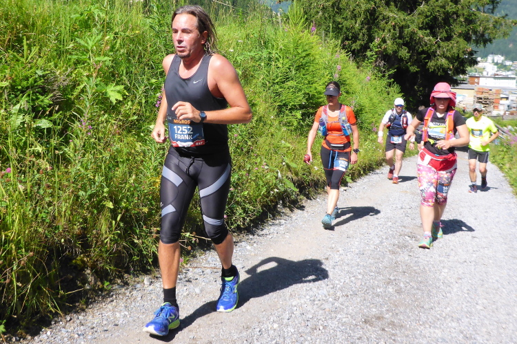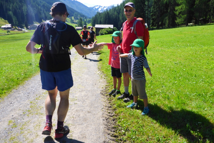 Das Gefälle ist so moderat, dass ich gut vorankomme. Wegen leichter Krämpfe kann ich kein Gas geben, das ist hier aber auch nicht notwendig. Leichtes Joggen reicht hier völlig aus. Immer wieder schwebt der Hubschrauber hoch und runter. Noch ein steiles Stück Straße, dann habe ich den Talgrund erreicht. Es geht jetzt an der Sertiger Straße entlang und ein paar Zuschauer feuern uns sogar an. Irgendwann weisen Helfer mit rhythmischem Klatschen auf einen Wiesenweg an den Almen entlang. Eine kleine Steigung gehe ich nochmals hinauf, dann taucht Sertig Dörfli vor mir auf.