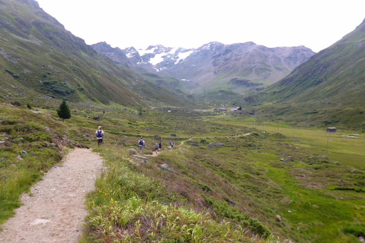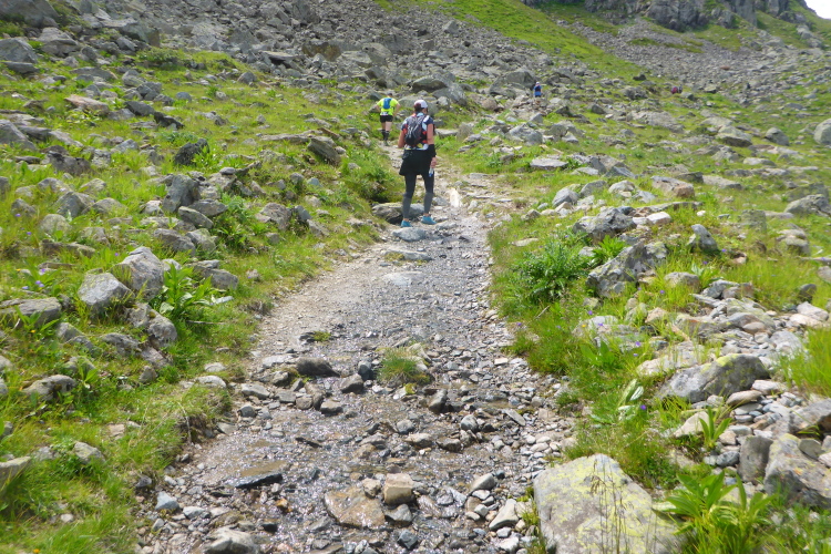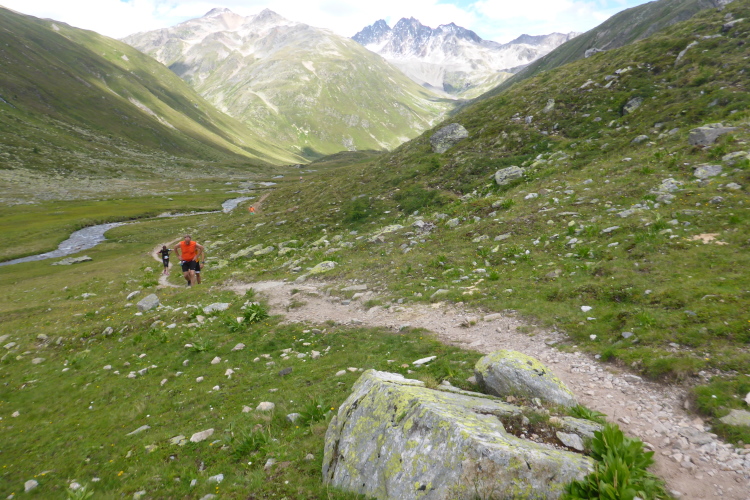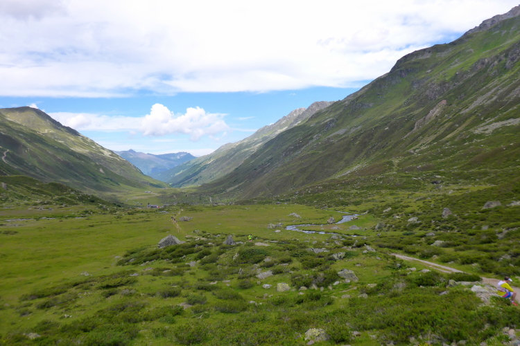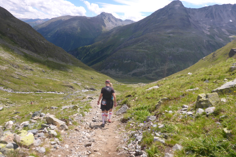 Mal mehr, mal weniger steil führt ein schmaler Pfad hinunter. Ein breites Geröllfeld muss überwunden werden. Höchste Konzentration ist notwendig, denn ein Sturz hier könnte schlimme Folgen haben. Immer wieder kommen Läufer von hinten angerannt. Das ist nichts für mich. Einmal blicke ich auf und kann bis ans Ende des vor uns liegenden Tals sehen. Unglaublich, dass wir bald dort unten sein werden. Aber nun konzentriere ich mich wieder auf den Weg.