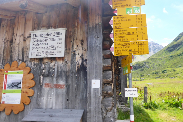 Die Landschaft wird karger, die Büsche spärlicher. Wellig führt der Weg immer weiter hoch. Ein paar Holzhäuser in der Ferne künden bei Dürrboden die nächste VP bei km 15 an. Die ersten 2 Stunden sind wie im Flug vergangen. Es ist gerade 12 Uhr vorbei, Zeit, um etwas zu essen. Banane und Tee müssen sein. Es gibt auch Iso. Dürrboden liegt bereits 2000 m hoch und besteht hauptsächlich aus einem Gasthaus. Die Wanderer auf der Terrasse machen Mittag. Ich lasse noch meine Handflasche füllen dann trolle ich mich. Hier ist mir eindeutig zu viel los. In Dürrboden vereinigen sich die beiden Quellbäche Dischmabach und Furggabach zur Dischma, die dann bei Davos in den Landwasser fließt. Wir überqueren den Dischmabach und verlassen nun endgültig bewohntes Gebiet.