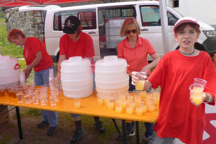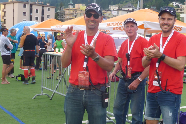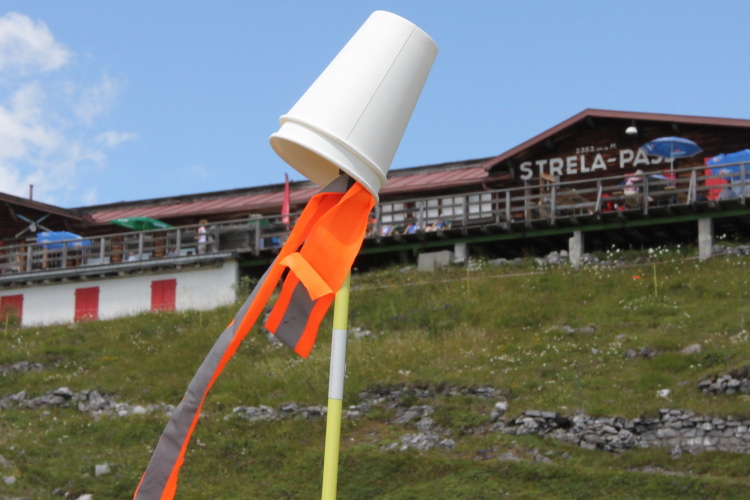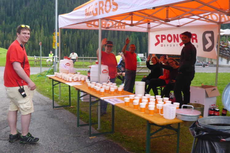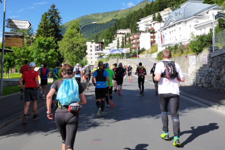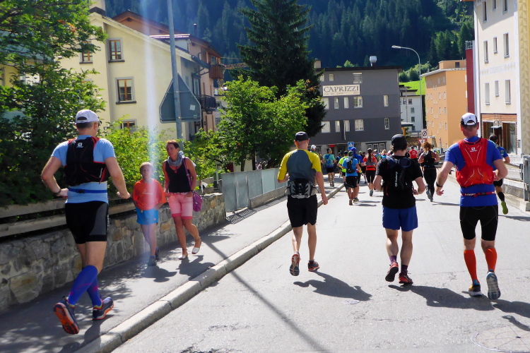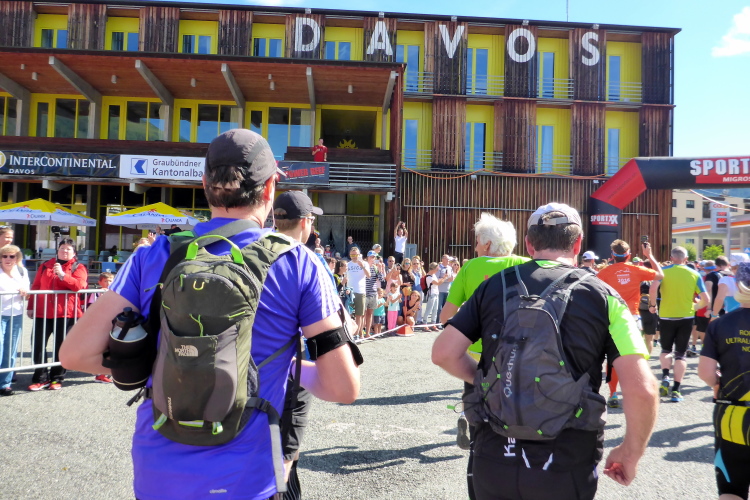 Nach einem kurzen Anstieg am Dorfeingang stehen die Zuschauer Spalier. Das motiviert zu einem kleine Spurt auf das Zelt der Moderatoren zu. Ich werde namentlich begrüßt und beglückwünscht. Es ist jetzt kurz nach 17 Uhr und ich habe noch massig Zeit für das letzte 11 km lange Teilstück nach Davos. Aus Wannen mit Schwämmen kann man sich Kühlung verschaffen. Dann genehmige ich mir noch Cola und Tee.
