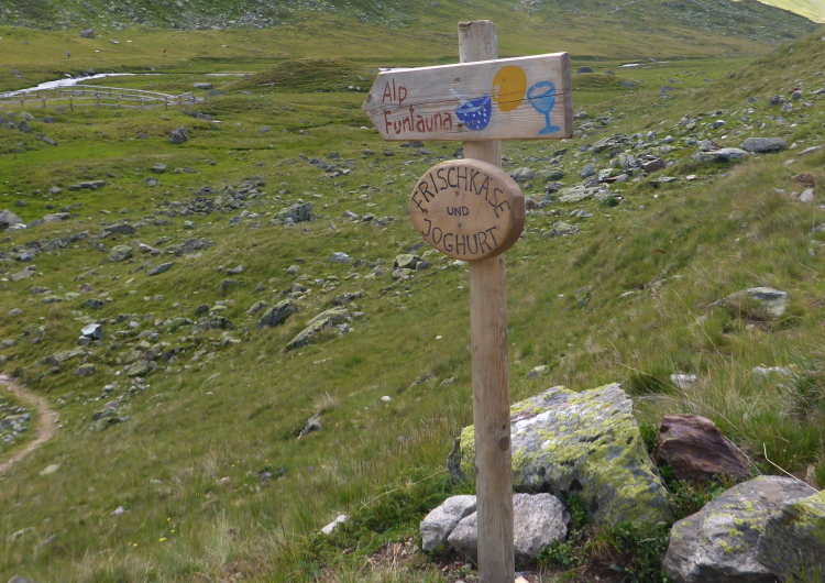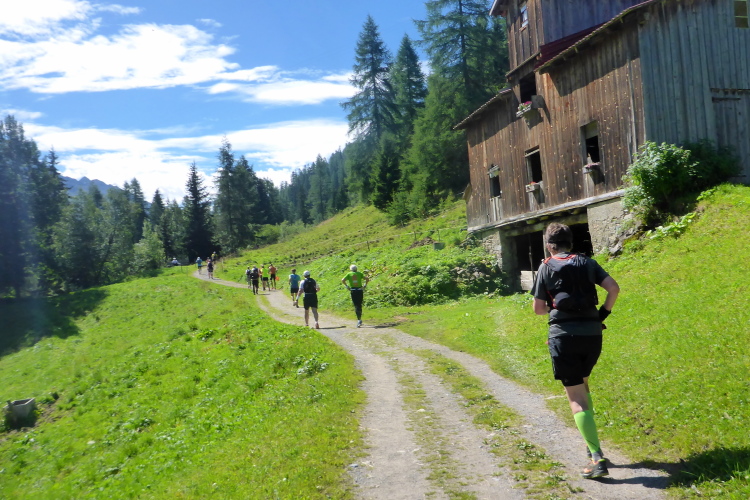 Hinter der letzten Brücke wird der Weg breiter und flacher. Eigentlich war hier in den Vorjahren eine VP. Nicht dass ich durstig wäre, aber die fehlende Abwechslung vermisse ich doch. Ein Almwirtschaftsweg führt mehrere Kilometer am Chuealpbach entlang bergab. An der Melkstation warten die Wiederkäuer geduldig, bis sie an der Reihe sind. Der Brunnen hier dient vielen Läufern als willkommene Abkühlung.