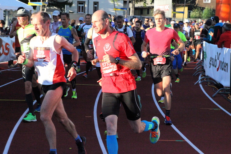 Auf der Straße überhole ich eine applaudierende Wandergruppe. Die Straße ist für den Verkehr gesperrt, einige Zuschauer und Passanten feuern mich lautstark an. Im Stadion geht es direkt auf die Laufbahn. Die Moderatorin sagt mich an, ich fühle mich so gut, dass ich noch einen veritablen Endspurt hinlege. Erstaunlich viele Zuschauer sind noch im Stadion und machen richtig Lärm, dann habe ich es geschafft.