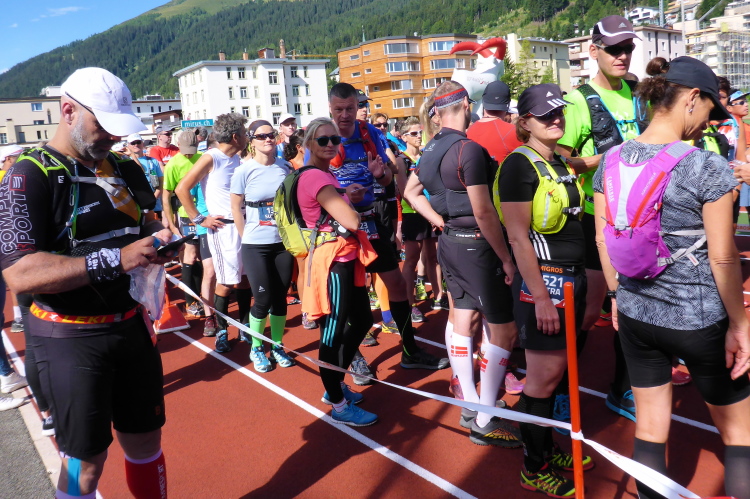 Letztes Jahr gab es den S42, der dieses Jahr als K47 angeboten wird. Der Panoramatrail wird ausgespart, dafür läuft man zur Alp Funtauna, die Strecke ist damit 5 km länger. Das hört sich interessant an - also nichts wie hin. Am Vortag holen wir unsere Startnummern im Kongresshaus. Zum ersten Mal ist der Zeitmesschip in der Startnummer integriert. Wir bummeln noch über die Läufermesse, die hier ganz auf Trailrunning ausgerichtet ist, und versuchen Neuigkeiten über das Wetter zu erfahren. Die Prognosen sind uneinheitlich, Gewitter möglich.
