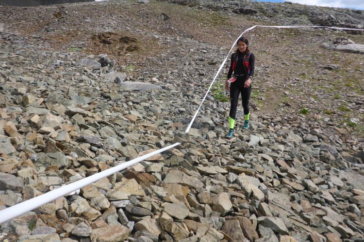 Als Einstieg führt ein weiterer Singeltrail relativ flach durch blühende Wiesen direkt am Bach entlang. Wanderer haben es sich zwischen hohen Steinen bequem gemacht und freuen sich mit uns. Vor mir am Hang kann ich bunte Punkte erkennen. Das sind Läufer, die bereits weit vor mir sind. Der Weg wird schmaler und steiniger. Wir sind nun dem Gletscher ganz nah, und ich meine, ab und zu einen frischen Wind zu spüren. Vom letzten Jahr weiß ich ungefähr, wo es langgeht. Wir halten uns rechts, der Weg ist nicht zu verfehlen. Ein Blick zurück zeigt mir, wie hoch ich schon bin. Die Häuser von Dürrboden sind inzwischen ganz klein.
