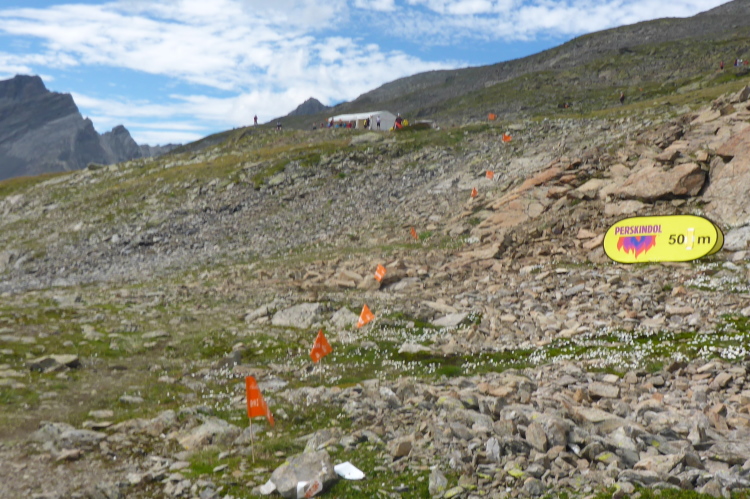 Seit einiger Zeit kann ich in der Ferne auf halber Höhe der rechten Bergflanke, farbige Punkte ausmachen. Nein, das kann unmöglich unsere Laufstrecke sein, das wäre ja richtungsmäßig wieder zurück. Vor mir steigt der Pfad nun steil an. Oben steht ein gelbes Zelt. Ist hier vielleicht schon die nächste VP? Beim Näherkommen erkenne ich, dass von der anderen Seite ebenfalls Läufer auftauchen. Das Zusammentreffen der Strecken des K78, K36 und unserem K47 steht unmittelbar bevor. Am Treffpunkt stehen die Helfer und begrüßen jeden Läufer und feuern sie an. Verpflegung gibt es hier nicht.