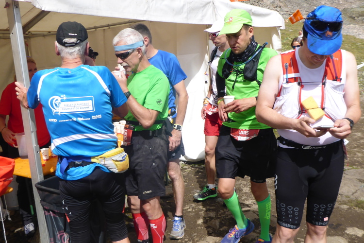 Die Helfer der VP sind auf alles vorbereitet. Die Masseure und Physiotherapeuten arbeiten auf Hochtouren. Ich genehmige mir jetzt Bouillon und Cola. Alpinbrötli, eine Spezialität beim Swissalpine, gibt es auch. Immer noch wie in Trance genieße ich die unglaubliche Fernsicht. Sobald die Beine sich etwas erholt haben, erklimme ich die Passhöhe. Trotz der starken Schneefälle vom letzten Wochenende ist nur noch ein kleines Häufchen hier oben übrig. Kurzes Posen für den Fotografen; dann geht es bergab.