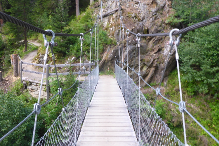 Weil die nächste VP erst in 6 km kommt, beschließe ich, meine Flasche direkt leer zu trinken und bei jeder Möglichkeit wieder aufzufüllen. Bäche gibt es unzählige, so habe ich immer frisches Wasser bei mir und kann auch anderen aushelfen. Ich komme gut voran, bis ein sehr schmaler Steg über einen tosenden Bach versucht mich auszubremsen. Vermutlich ist das Ganze nur einen Meter hoch, aber für mich ist das bereits zu viel. Ich fixiere das gegenüberliegende Ufer und balanciere unbeschadet hinüber.