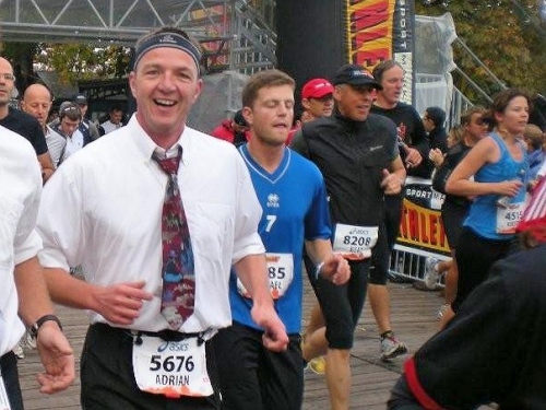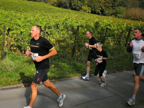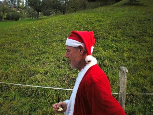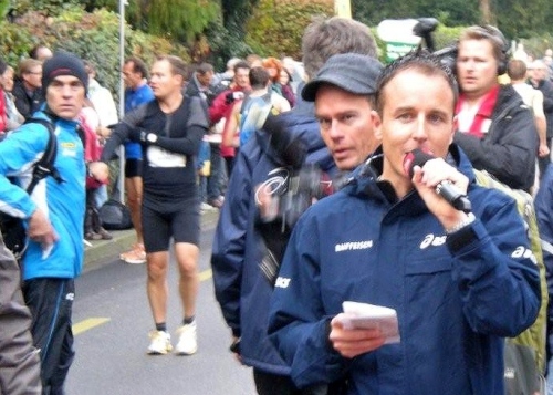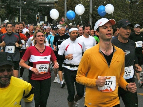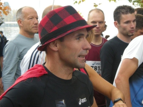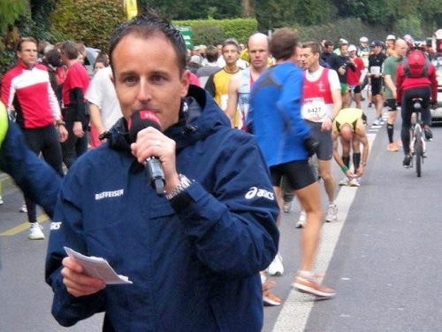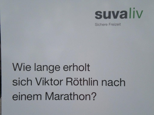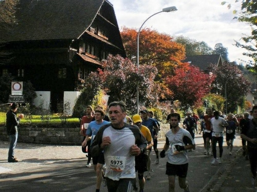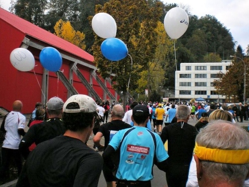 Auch in der Garderobe ist die Stimmung locker und unverkrampft. Der strenge Geruch von Wintergrün und anderen wärmenden Ingredienzen der eingeriebenen Wundermittelchen helfen mir durchzuatmen. Der Schnupfen, der sich am Freitag mit einem leichten Brennen angekündigt hat, ist Tatsache geworden und bringt mich im Vorfeld zur vernünftigen Planung meiner Einteilung der Kräfte. Nur die Zeiteinteilung habe ich nicht im Griff. Vor lauter Plaudern links und rechts bin ich etwas spät dran, denn ich habe mich noch mit der „Laufenden Nase“ verabredet. Er ist einer der Läufer, die mit besonderen Aktionen bei ihren Läufen Geld für einen guten Zweck sammeln. Daniel Raum ist dabei an der roten Nase und den Jonglierbällen zu erkennen, die in Luzern während 21 Kilometern laufend in Bewegung sein werden. Ich schaffe es zwar fast, rechtzeitig am vereinbarten Ort aufzukreuzen, trotzdem können wir uns nicht finden. Schade, ich würde ihm gerne auch einen Platz in der Bildergalerie einräumen.