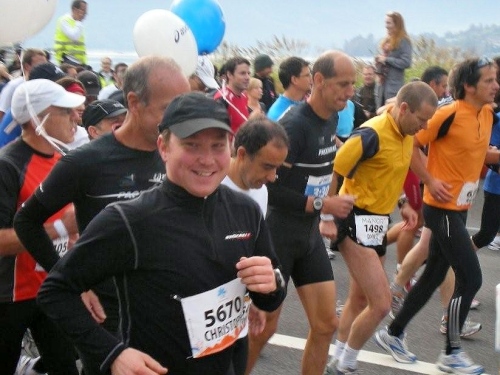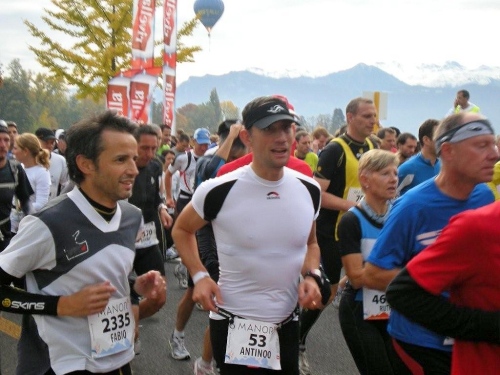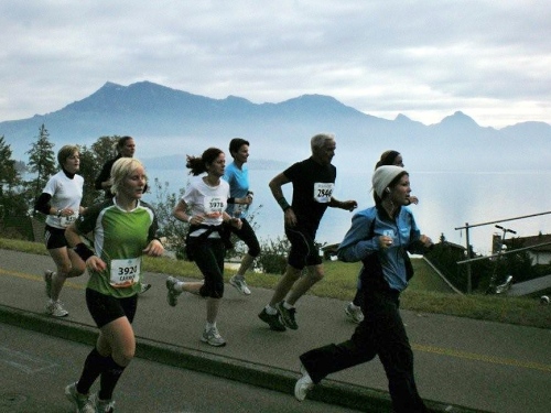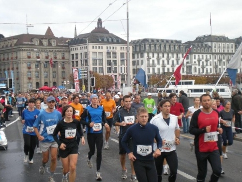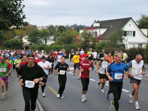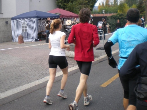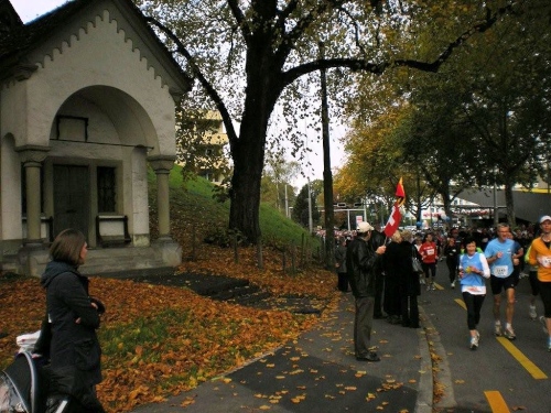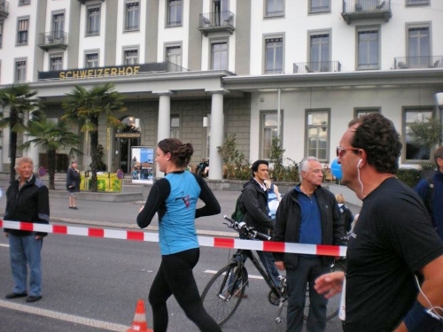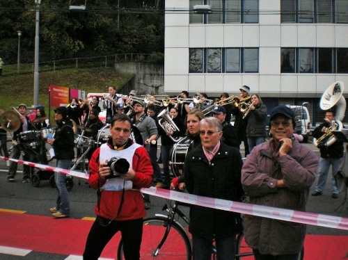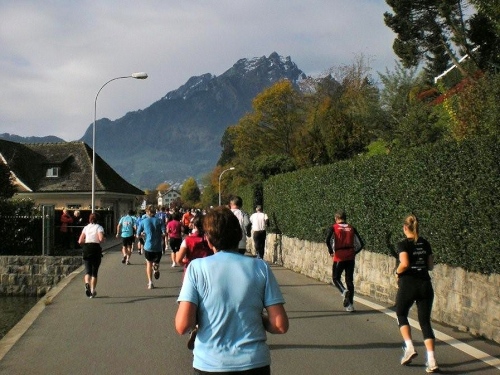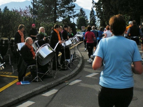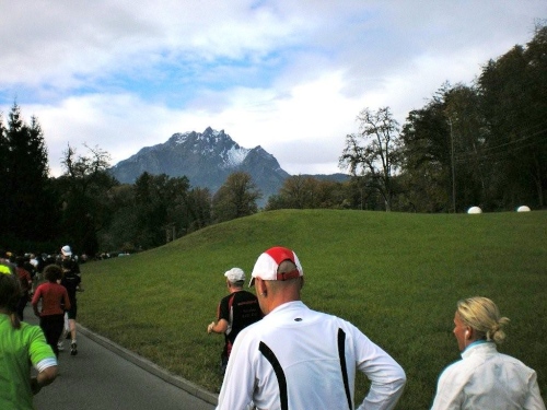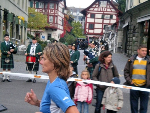 Bis ich die Startlinie überquere, habe ich meinen Tritt gefunden und kann ungehindert mein Tempo laufen. Blechmusik links, Dudelsackklänge der „Pipes and Drums of the Lucerne Caledonians“ rechts, auf beiden Seiten Zuschauer, die sich nicht zufällig an die Strecke verirrt haben – wenn es so weitergeht, dann gibt es eine lockere Sache.