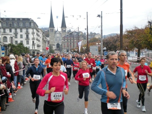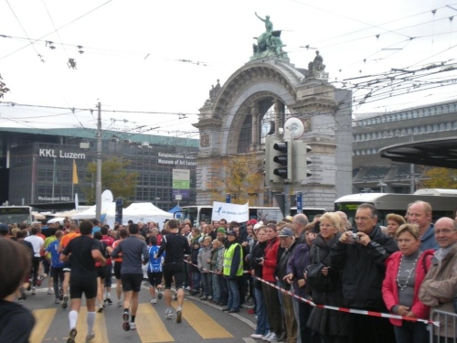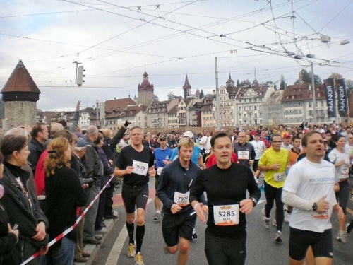 Wer sich im Vorfeld keine Zeit für eine Stadtbesichtigung genommen hat, dem droht schon auf dem zweiten Kilometer eine akute Reizüberflutung. Die Menschenmassen am Straßenrand sind das eine, der Blick auf die Sehenswürdigkeiten der Stadt das andere. Beim Überqueren der Seebrücke liegen rechts im Blickfeld die Kapellbrücke und der achteckige Wasserturm aus dem Jahre 1300, dahinter die Jesuitenkirche. In diesem ersten großen sakralen Barockbau der Schweiz wird eine Originalkutte von Bruder Klaus, dem Schweizer Nationalheiligen, aufbewahrt. Weil ich die orange Kutte des Marathon-Klaus trage, muss ich meine Augen noch für weitere Sehenswürdigkeiten offen halten. Zum Beispiel für den Luzerner Hausberg, den Pilatus. Schwierig zu erkennen ist der nicht, da er sich im Hintergrund dieses Ensembles aus verschiedenen Zeitepochen unübersehbar über die Altstadtsilhouette erhebt.
