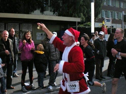 Gut macht das Wetter mit und zeigt die sonnige Seite des Herbstes. Sonst hätte ich meine Zweifel, ob die Uhren in der vergangenen Nacht wirklich nur eine Stunde zurück- und nicht zwei Monate vorgestellt wurden. Der Grund dafür heißt Dieter und taucht vor mir als Weihnachtsmann auf. Er trägt nicht den in der Zentralschweiz üblichen Bischofsornat des heiligen Nikolaus, nicht den Kapuzenmantel des Nikolaus aus dem Schwarzwald, der uns als Kinder anständig werden ließ, aber mit seiner roten Hose, der Jacke, der Mütze und dem Glöckchen in der Hand wird er vom Publikum sofort als „Samichlaus“ erkannt, tituliert und gefeiert.