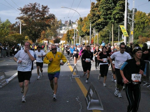 Mittlerweile sind die Zugläufer schon ein Stück vor mir, also muss ich einen Zacken zulegen und etwas Vorsprung herauslaufen, bevor ich wieder ausgiebige Fotostopps einlegen kann. Überholen ist kein Problem, der Engpass ist schon vorbei und etwas zu Trinken gibt es auch schon bald. Schon von weitem sind die Schilder zu sehen, die den Weg zur richtigen Zapfsäule weisen. Nach vier Kilometern wird auf beiden Straßenseiten nebst Wasser bereits Iso angeboten. Hier und bei allen folgenden Verpflegungsposten wird am Schluss nochmals Wasser abgegeben, was ich jeweils sehr schätze. Für mich ist hier gesorgt, wer aber weiter gehende Verpflegungsbedürfnisse hat, kommt auch auf seine Rechnung. In der nach Hause geschickten Teilnehmerzeitung ist genau vermerkt, wann und wo am Verpflegungsposten es was genau gibt. Bananen, Riegel und Gel Wasser ergänzen das flüssige Angebot von offizieller Seite, an mehreren von Zuschauern initiierten Posten wird zudem Wasser, Cola und wer-weiß-was-noch gereicht.