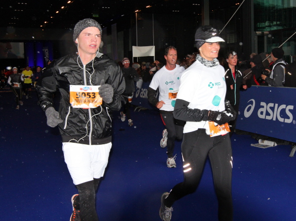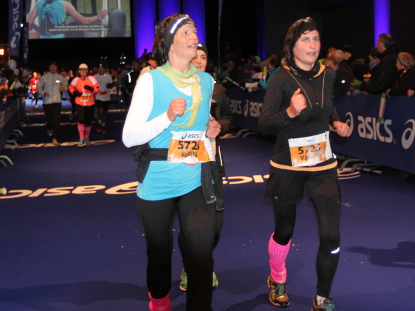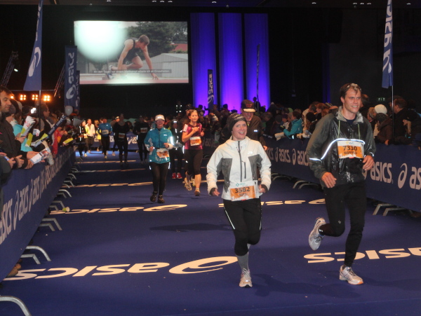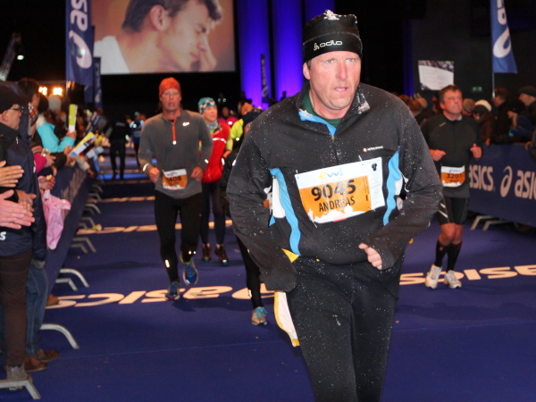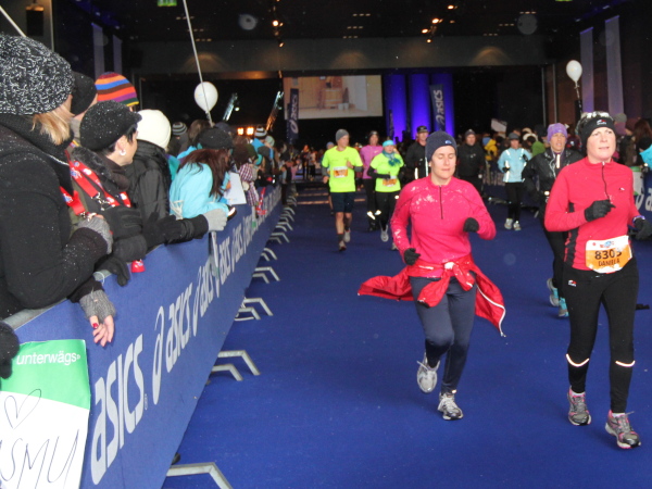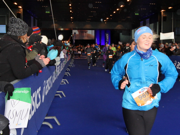 Auf kürzestem Weg, nämlich durch’s Verkehrshaus, geht es jetzt ins Ziel. Wir rennen auf eine blaue Wand mit lauter Straßenschildern zu. Die Leute spielen verrückt, beklatschen und bejubeln die Läufer. Der rote Teppich ist mehr weiß als rot, dann endlich ein Dach über dem Kopf, noch mehr Zuschauer, Cheerleaders, eine Bombenstimmung, ein Händedruck vom OK-Chef Hansruedi Schorno, das war’s. Klasse, kann ich nur sagen.