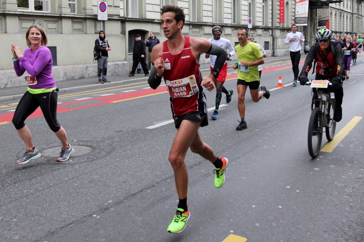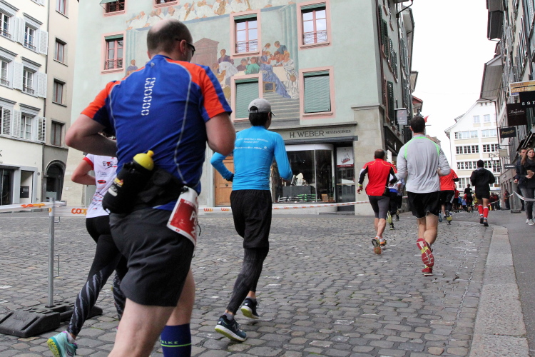 Im folgenden Wohnquartier ist für Musik und Applaus gesorgt. Die Richtungsänderungen wären allenfalls für die Weltelite auf der Jagd nach einem neuen Rekord hinderlich, die meisten Anwesenden in Läuferbekleidung haben damit nichts zu tun – das sage ich, ohne die Leistung derjenigen zu schmälern, die an diesem Tag um den Schweizermeistertitel laufen. Durch diese Art der Streckenführung gibt es keine öden langen Geraden und ehe man sich versieht, steht schon das nächste Kilometerschild.