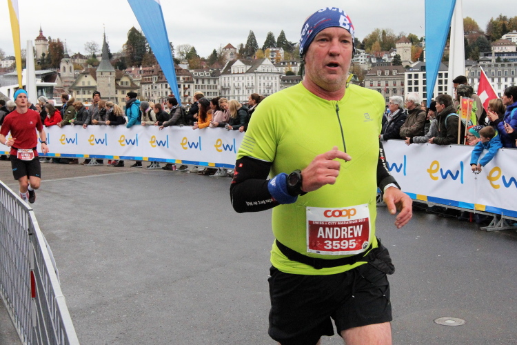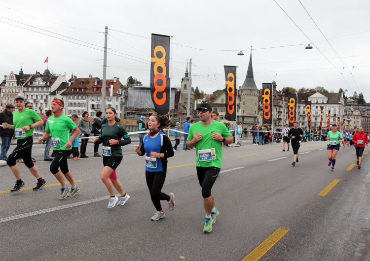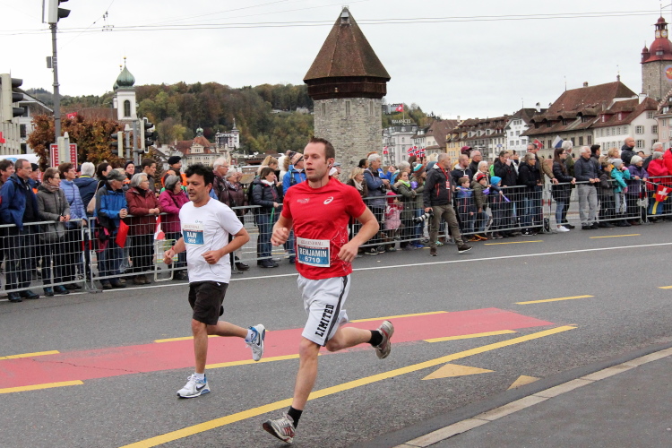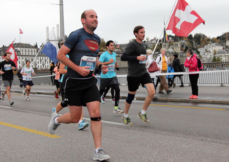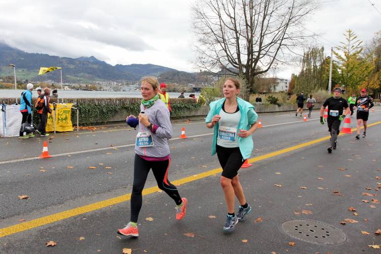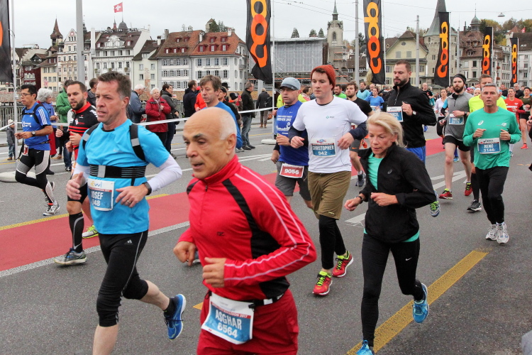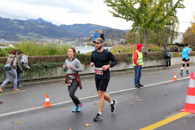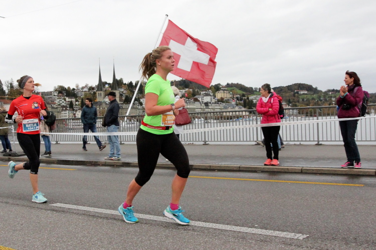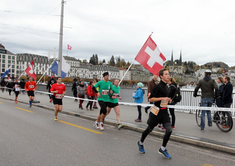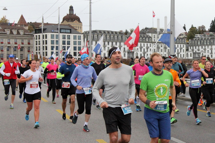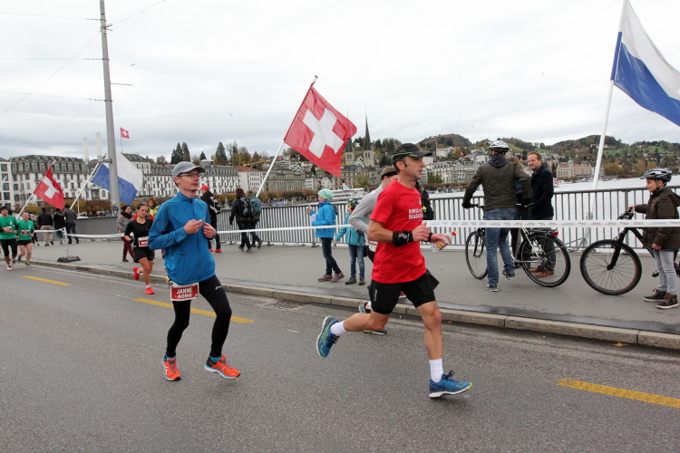 Die dazugekommenen Läufer machen die Strecke noch kurzweiliger als sie sonst schon ist und die weiteren Fixpunkte der zweiten Runde fliegen regelrecht vorbei. KKL, Kapellbrücke, Altstadt, nochmals das ganze Programm, dann der Schwanenplatz mit Moderation und schon steht die große Flagge am Rand, die uns Kilometer 40 signalisiert. Einige unserer ständigen Begleiter spüren, dass sie noch Reserven haben und ziehen davon, während Yvonne und ich motivierend auf ein paar andere einzuwirken versuchen und sie tatsächlich dazu ermuntern können, sich von uns ziehen zulassen statt zu gehen.