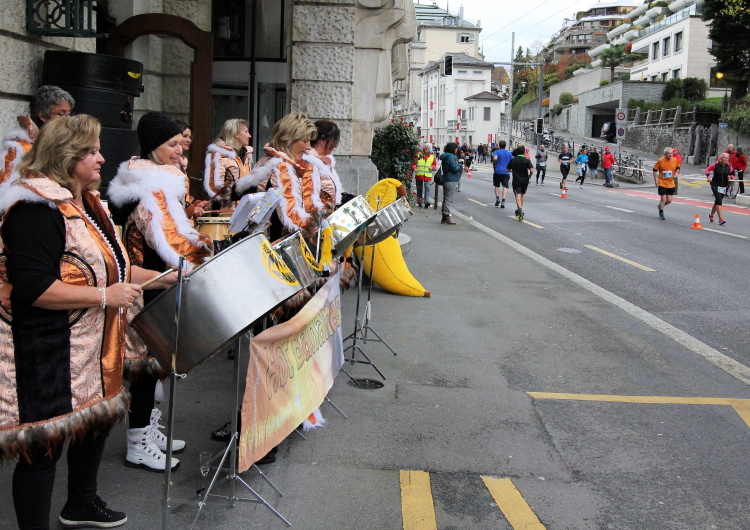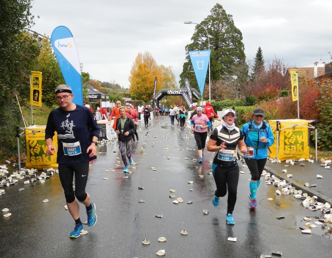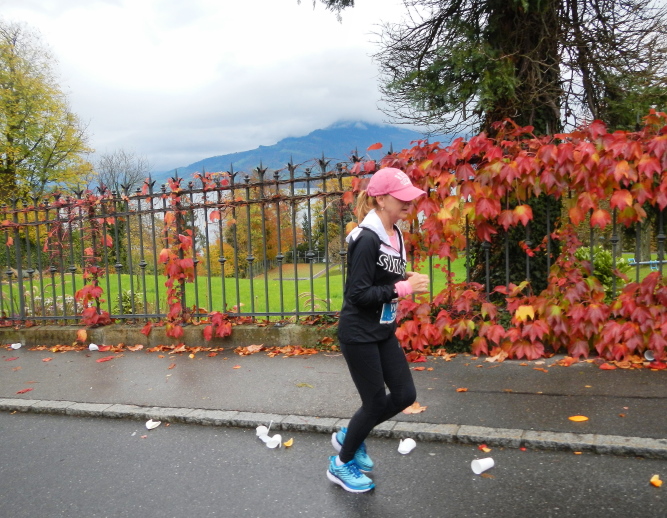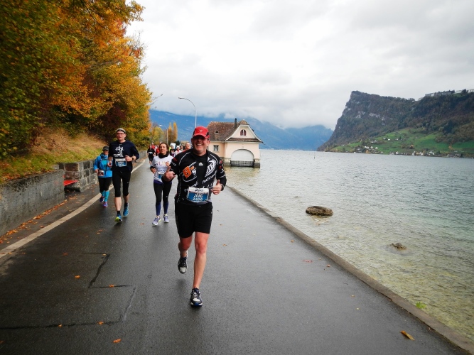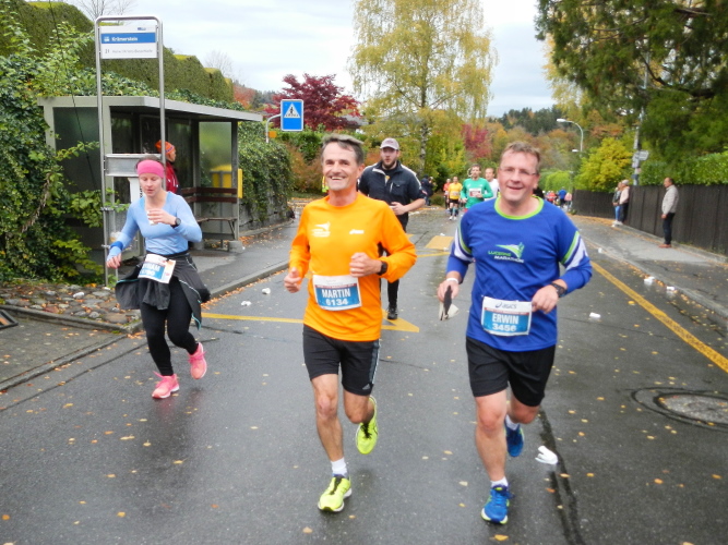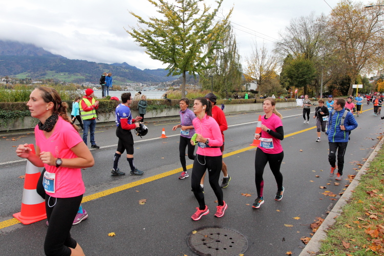 Mit einem sanften Rollen geht es auf die nächsten sechs Kilometer, während denen eine herbstliche und auch sonst bunte Kulisse die ebenso farbige Läuferschar in Szene setzt. Wiesen, Rebberge, der Vierwaldstättersee, Villen an exquisiter Wohnlage und die Strecke garniert mit Verpflegungsangeboten aus privater Initiative, Musik und immer wieder Gruppen von Zuschauern und Anwohnern, die jeden Vorbeikommenden feiern. Alles so fröhlich, freudig, entspannt und ohne Exzesse, einfach familiär.