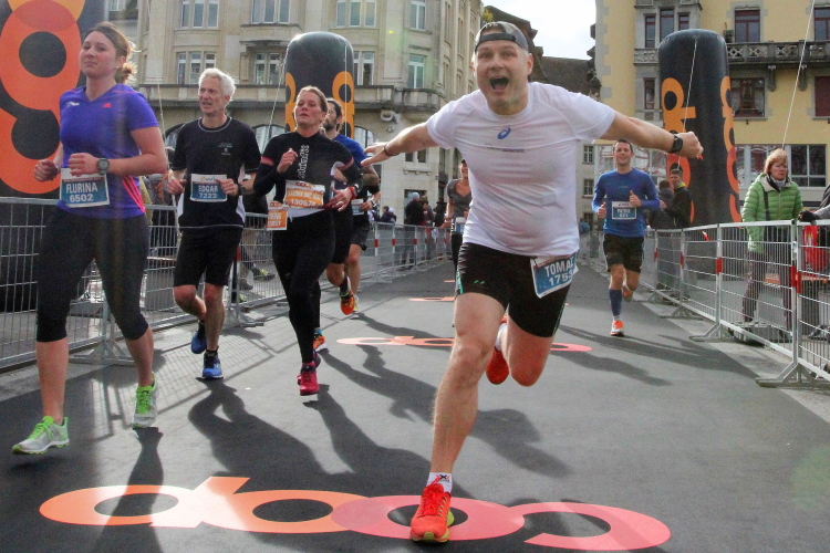 Im zweitletzten Block können Yvonne und ich eine kleine Truppe um uns scharen und werden auf der langen Geraden der Startaufstellung Stück für Stück nach vorne geführt. Dann geht es auch für uns los. Nach einer leichten Biegung geht es ziemlich gerade in Richtung Schwanenplatz. Es ist auch für mich nicht möglich, mich der tollen Stimmung zu entziehen. Auf diesen etwas zwei Kilometern spielen bereits mehrere Musikformationen auf und die Straße entlang der edlen Hotels ist gesäumt von Schaulustigen. Auch mit der Erfahrung zahlreicher Marathons, einige davon auch als Pacemaker, muss ich den Blick auf die Uhr richten und sämtliche Bremsmechanismen aktivieren, um nicht der Versuchung zu erliegen. Eine Minute gewonnen sind zwei verloren, das Marathontier kennt da kein Pardon. Es fällt mir nicht einfach, die Rekuperationsbremse eingeschaltet zu lassen. Am Hotel Schweizerhof vorbei kommen wir zum Schwanenplatz, wo die Moderatoren so richtig warmgelaufen sind.
